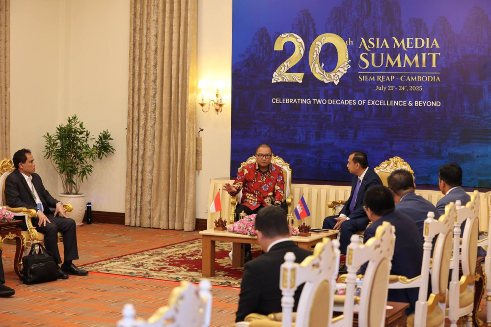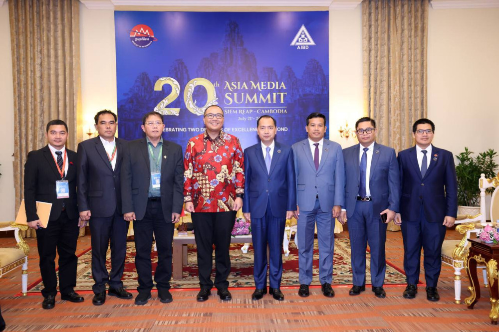 Cambodia’s Minister of Information H.E. Neth Pheaktra (R, Pic. 1), poses for photo with H.E. Santo Darmosumarto, Ambassador Extraordinary and Plenipotentiary of the Republic of Indonesia to the Kingdom of Cambodia, prior to their bilateral meeting on the promotion of cooperation on media and broadcasting, on the sidelines of the 20th Asia Media Summit in Siem Reap city this afternoon.