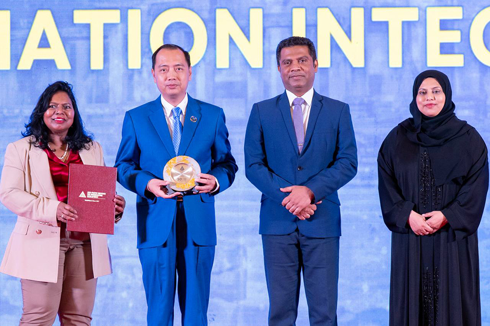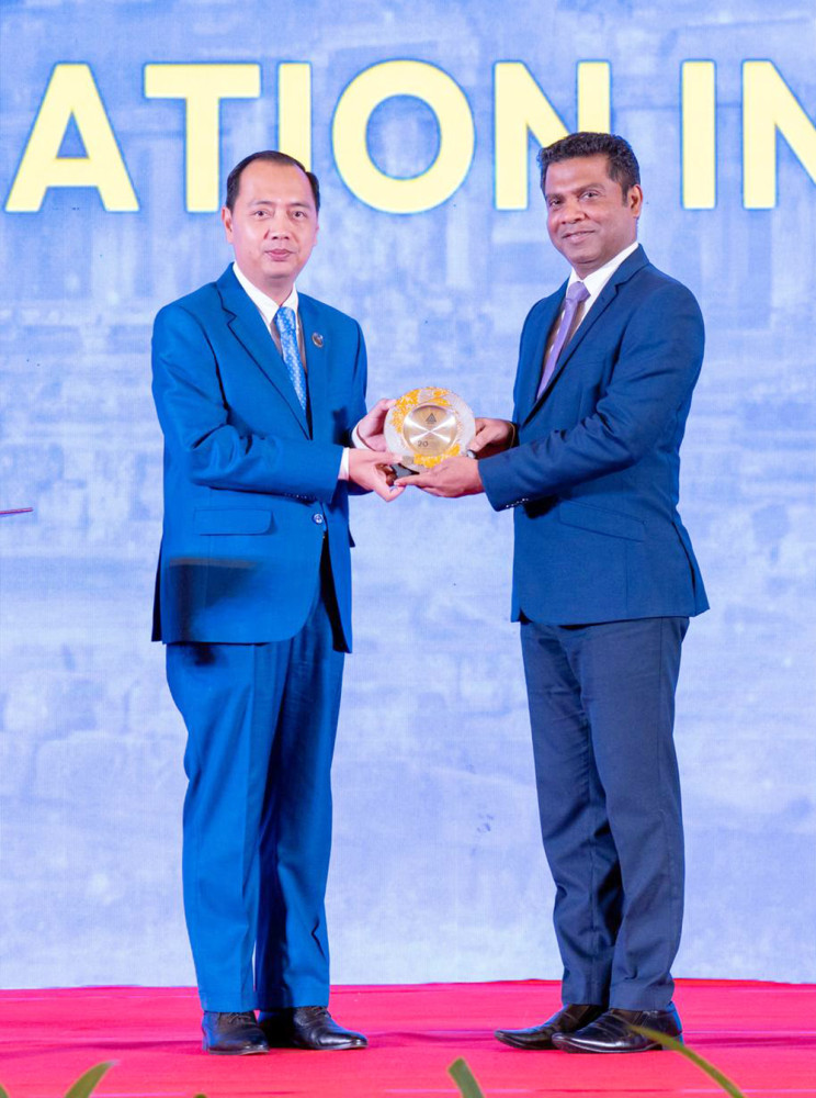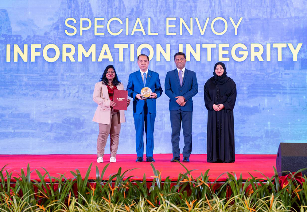H.E. Dr. Nalinda Jayatissa (R, Pic. 1), Minister of Health and Mass Media of Sri Lanka, presents a Special Award of “Special Envoy of Information Integrity” to H.E. Neth Pheaktra, Minister of Information of the Kingdom of Cambodia, the host of the 20th Asia Media Summit, in Siem Reap provincial city this afternoon.