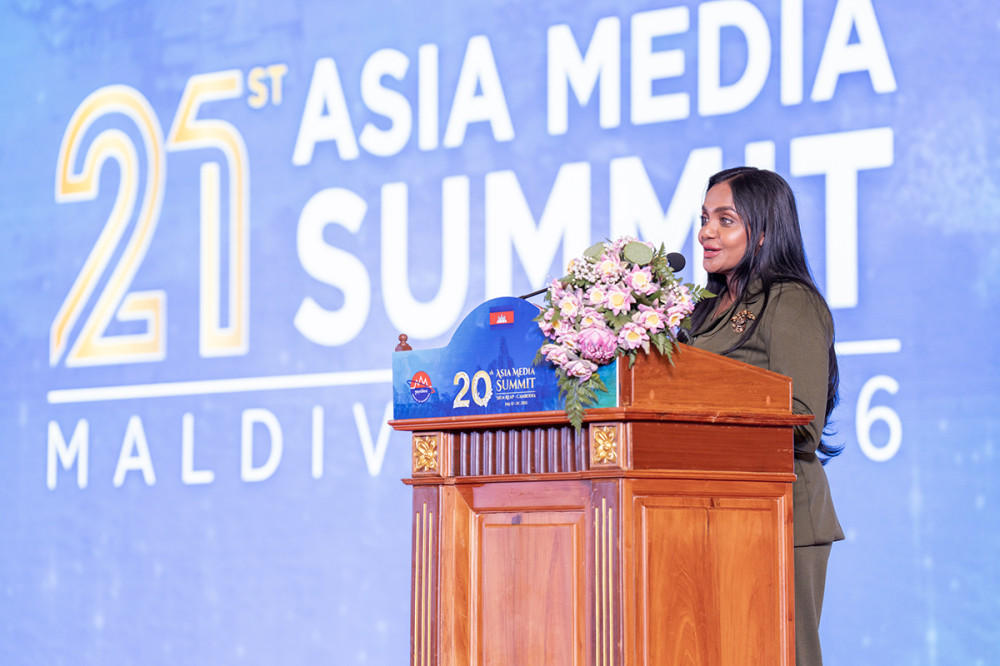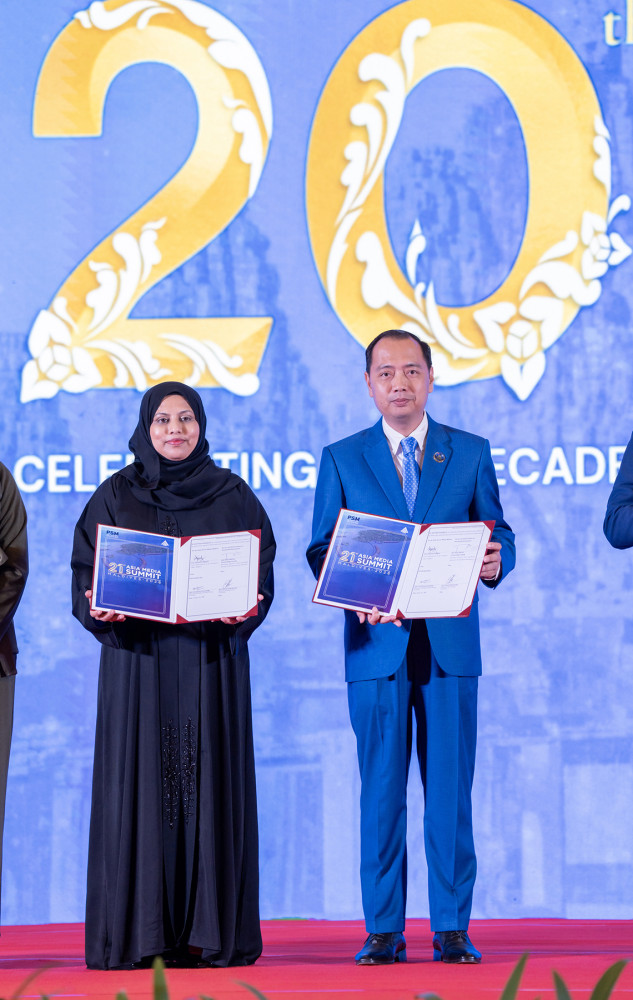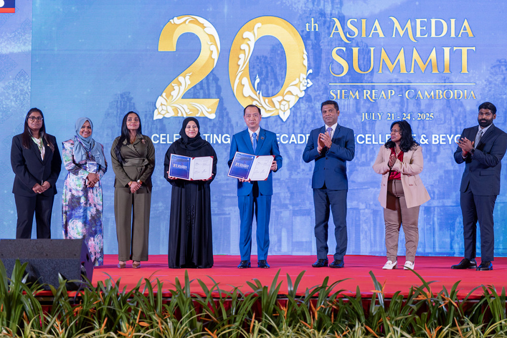 H.E. Neth Pheaktra (4th R, Pic. 1), Minister of Information of Cambodia, hands over the hosting of the Asia Media Summit (AMS) 2026 to Maldives, represented by H.E. Ms. Heena Waleed, Chief Spokesperson at the President’s Office, in Siem Reap provincial city this afternoon.