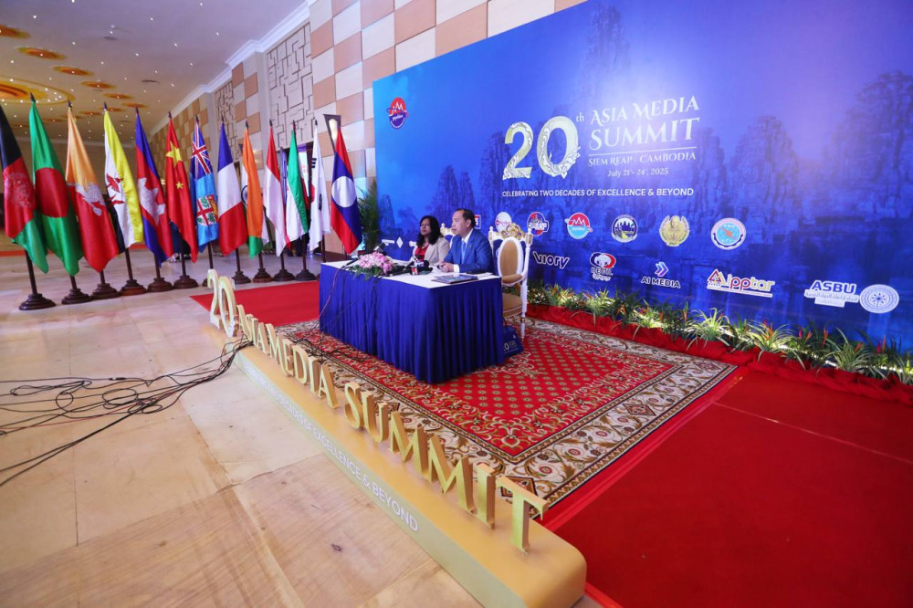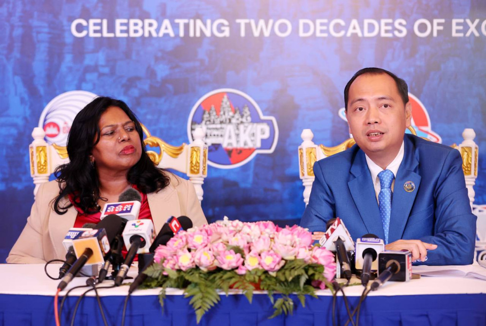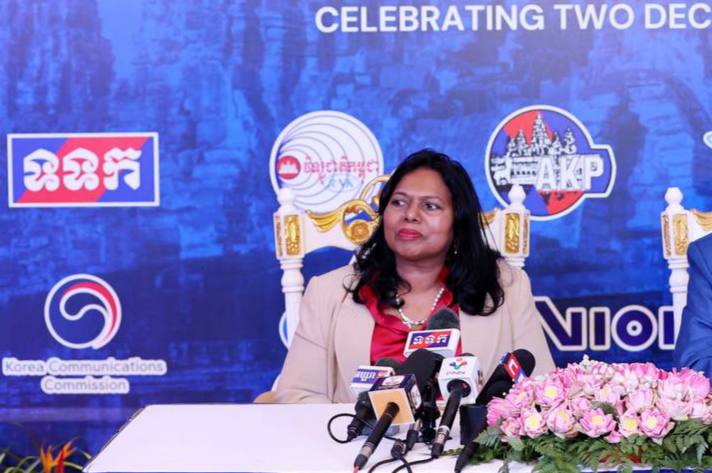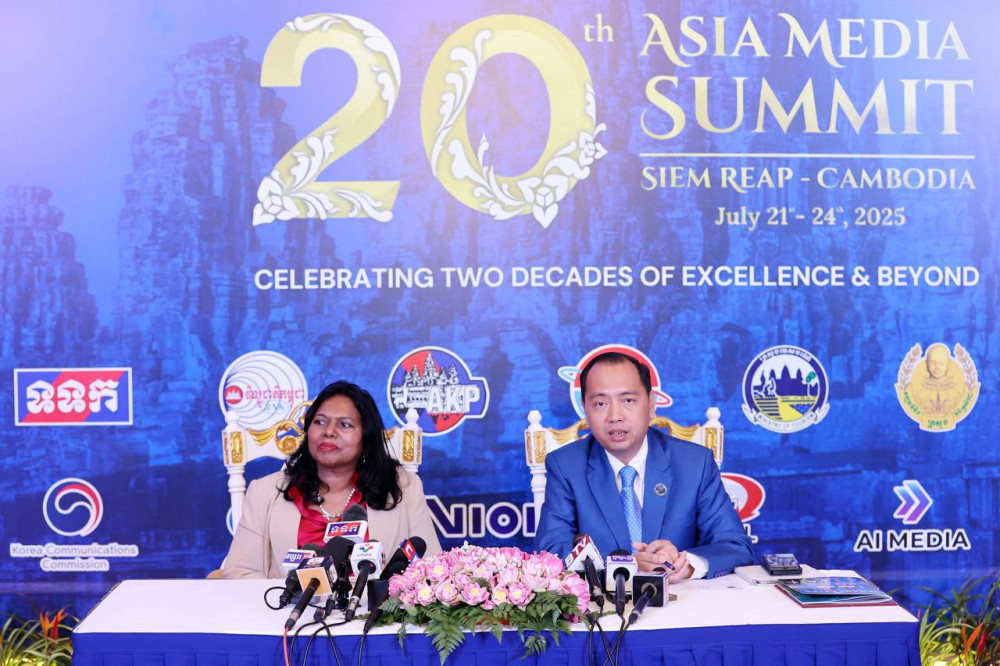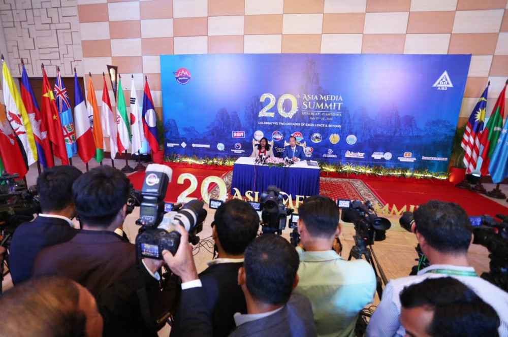 H.E. Neth Pheaktra (R, Pic. 1), Minister of Information, and Ms. Philomena Gnanapragasam, CEO and Secretary General of the Asia-Pacific Institute for Broadcasting Development (AIBD), hold press conference on the outcomes of the 20th Asia Media Summit (AMS), in Siem Reap provincial city this evening.
