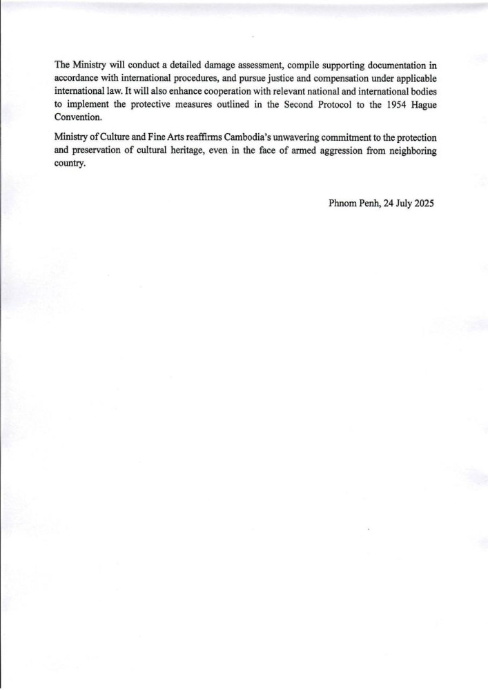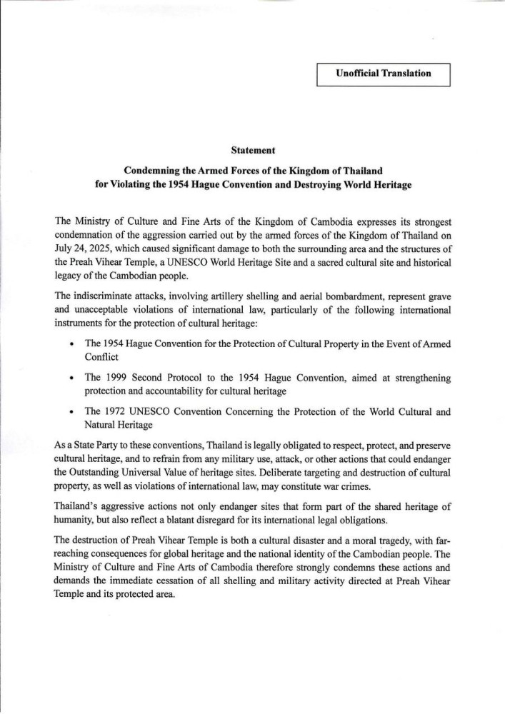The following is a statement of the Ministry of Culture and Fine Arts condemning Thai Army for violating the 1954 Hague Convention and destroying World Heritage: