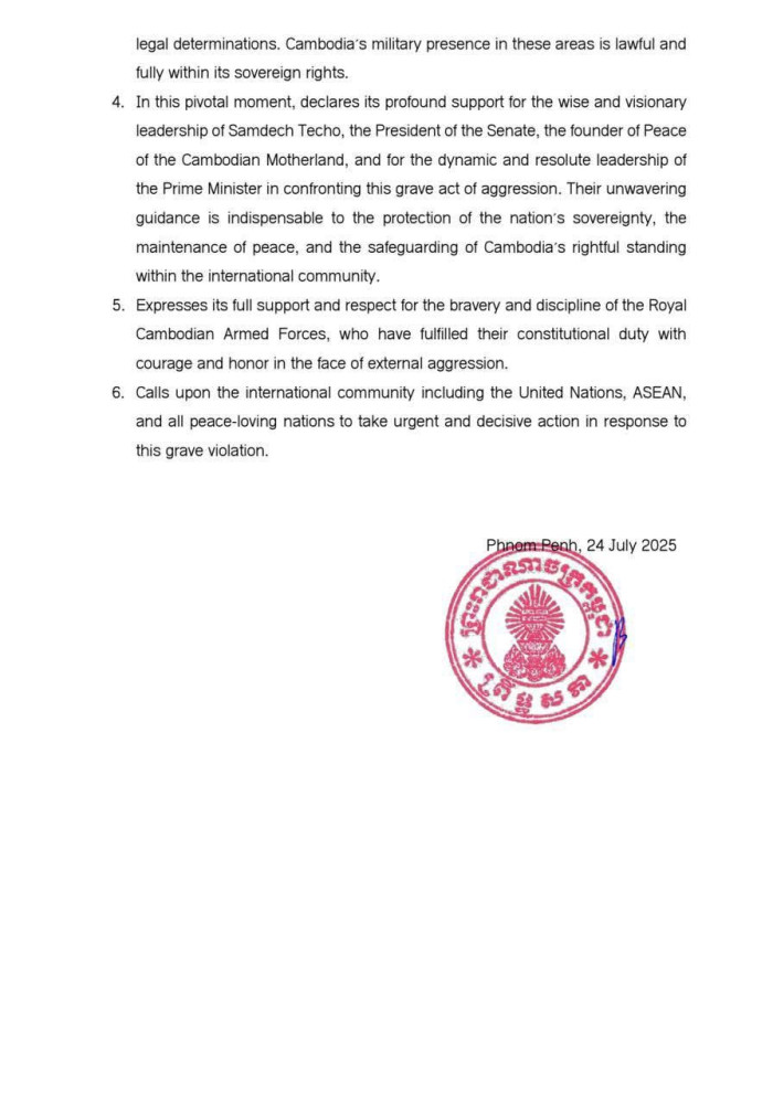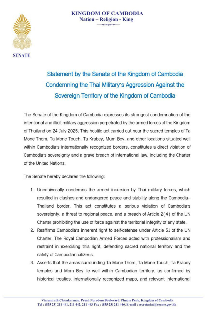 Statement by the Senate of the Kingdom of Cambodia Condemning the Thai Military's Aggression Against the Sovereign Territory of the Kingdom of Cambodia