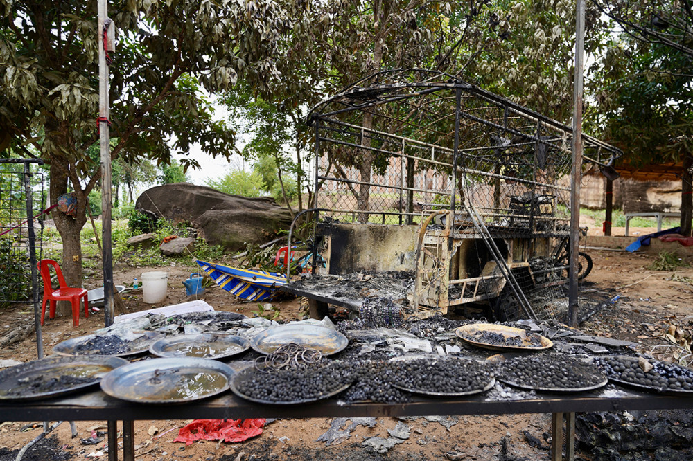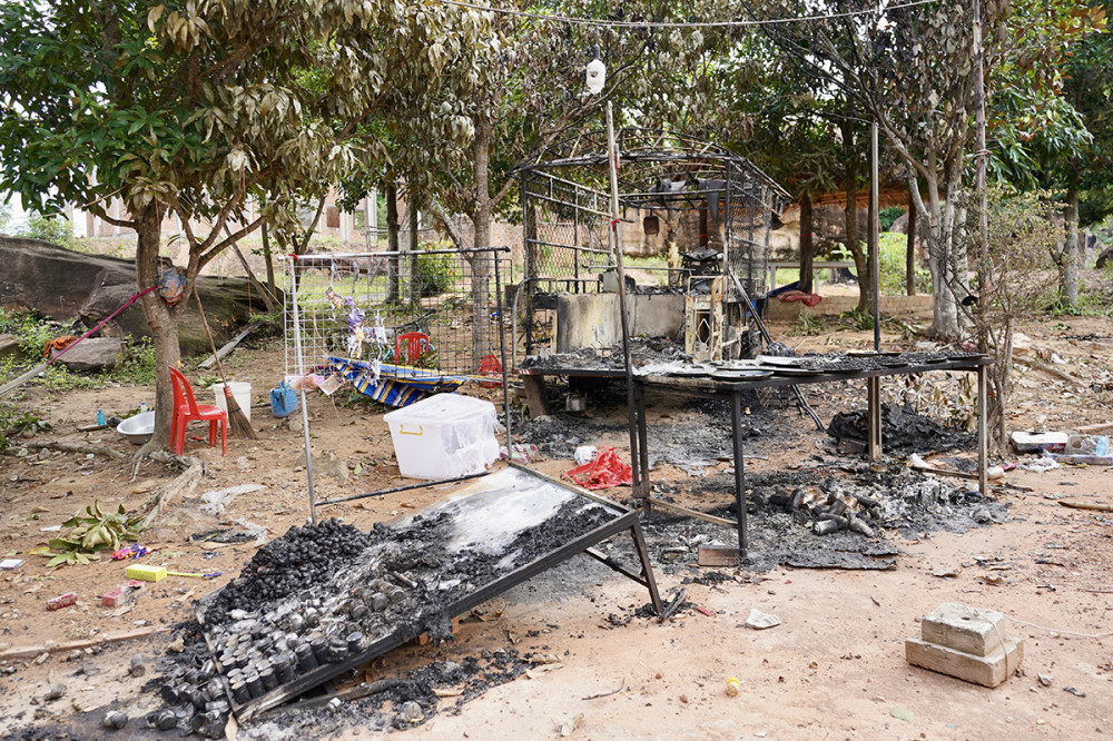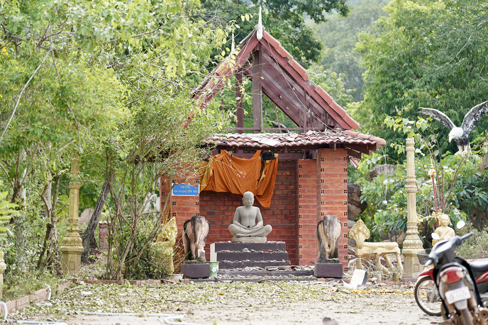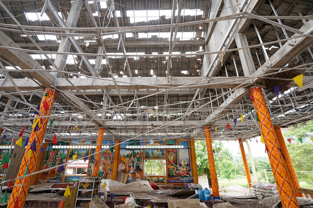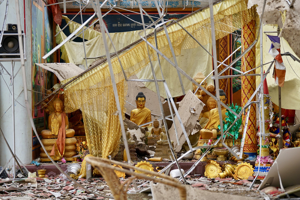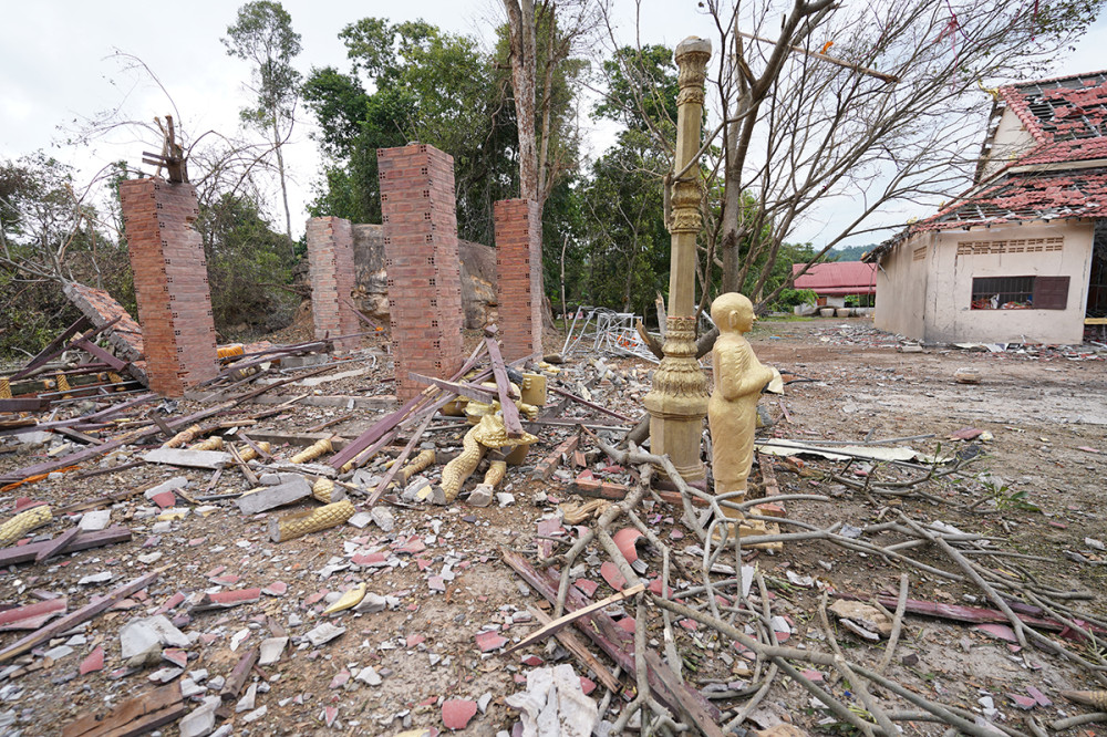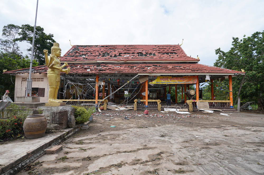 Tamone Sen Chey pagoda, located in Kok Mon commune, Banteay Ampil district of Oddar Meanchey province, is completely destroyed by aerial bombardment carried out by Thai invading forces on July 24, 2025.