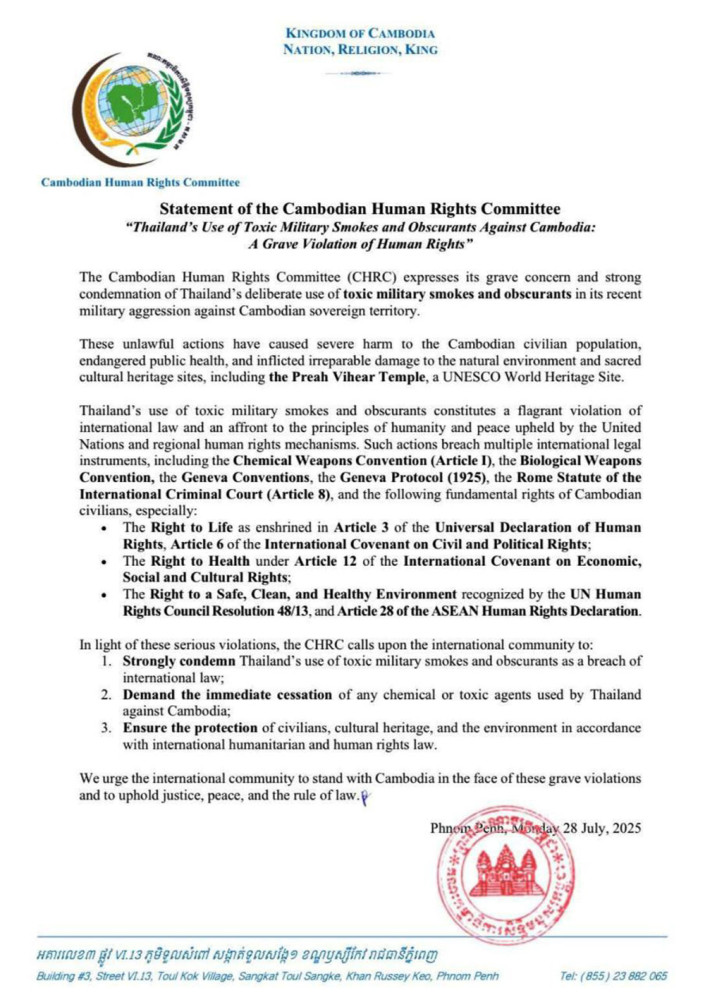 The Cambodian Human Rights Committee (CHRC) has in a statement expressed its grave concern and strong condemnation of Thailand's deliberate use of toxic military smokes and obscurants in its recent military aggression against Cambodian sovereign territory.