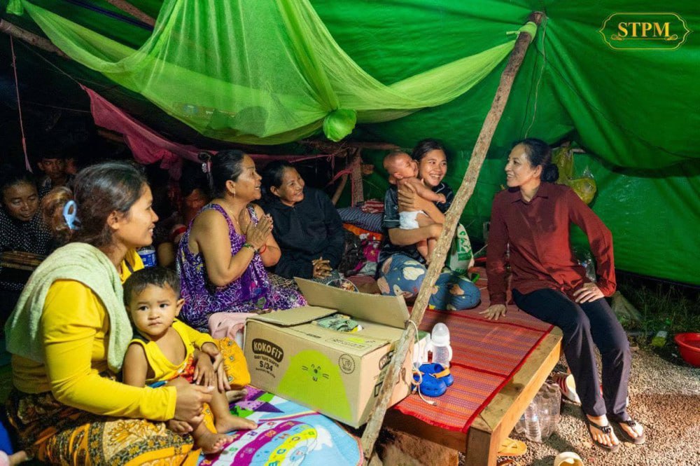 In the evening, the First Lady continued to Wat Po 5000 to meet with families, including elders, women, and children, who have sought refuge due to ongoing security concerns along the border. She conveyed greetings and well wishes from Senate President Samdech Akka Moha Sena Padei Techo Hun Sen, Samdech Kittiprittpundit Bun Rany Hun Sen, President of the Cambodian Red Cross (CRC) and her husband, Prime Minister Samdech Moha Borvor Thipadei Hun Manet.