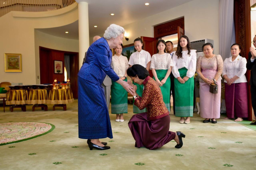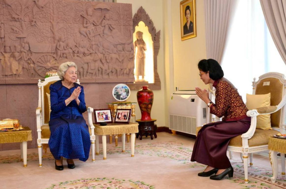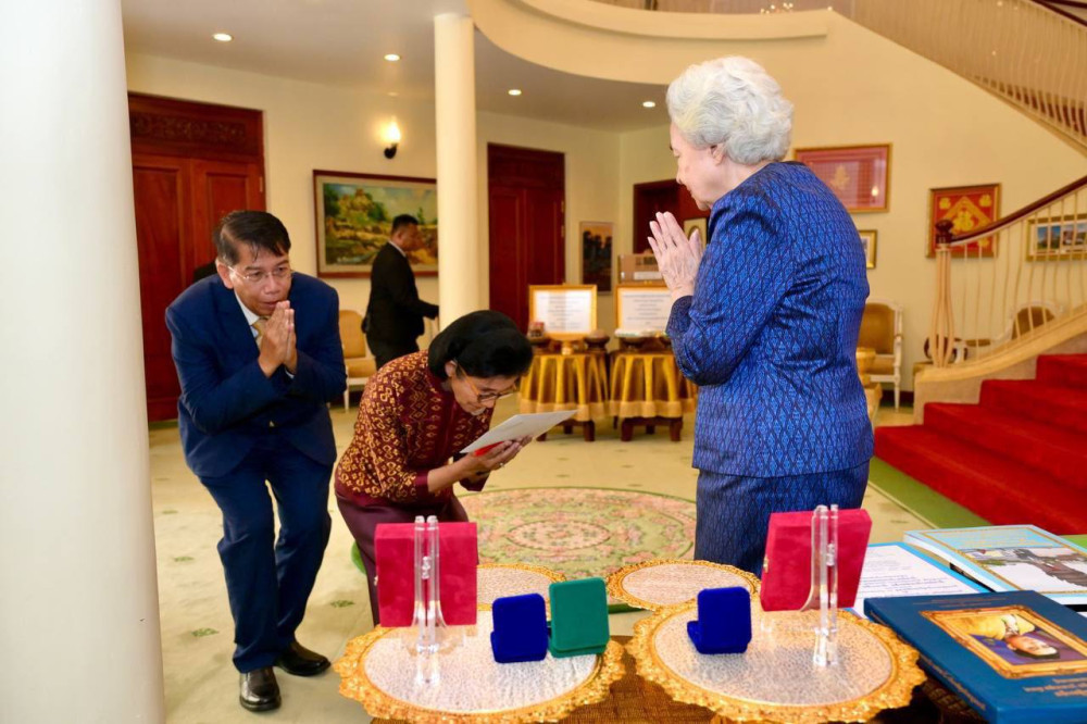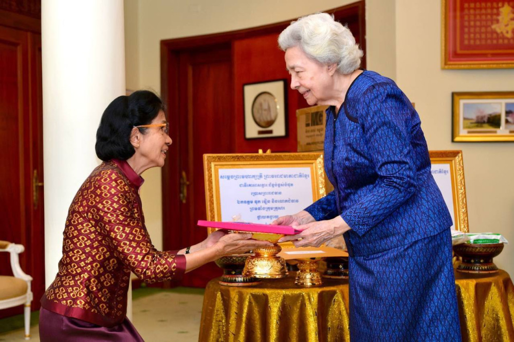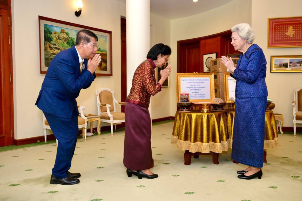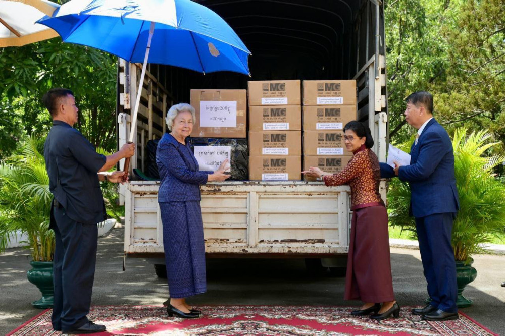 Her Majesty Queen-Mother Norodom Monineath Sihanouk, Honorary President of the Cambodian Red Cross (CRC), donates US$15,000 along with food and other materials, to the CRC via its Secretary General H.E. Ms. Pum Chantini, at the Royal Palace here on Aug. 4, to assist the displaced civilians.