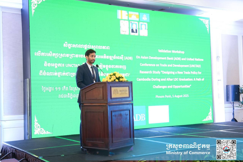 H.E. Mrs. Cham Nimul (Pic. 1), Minister of Commerce, addresses the participants while she was presiding over here at Raffles Hotel Le Royal in Phnom Penh this morning the opening ceremony of a Validation Workshop on a Research Study” Designing a New Trade Policy for Cambodia During and After LDC Graduation: A Path of Challenges and Opportunities, “ jointly conducted by the Asian Development Bank (ADB) and the United Nations Conference on Trade and Development (UNCTAD).