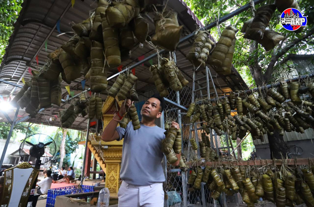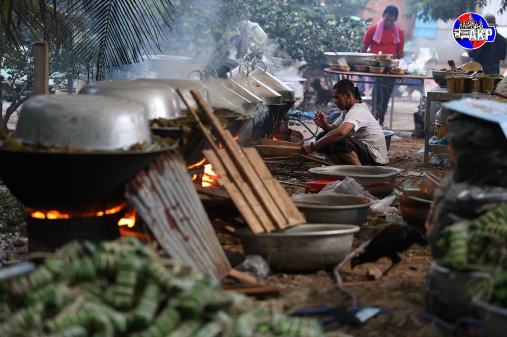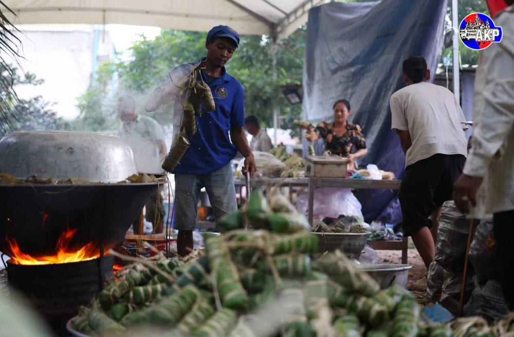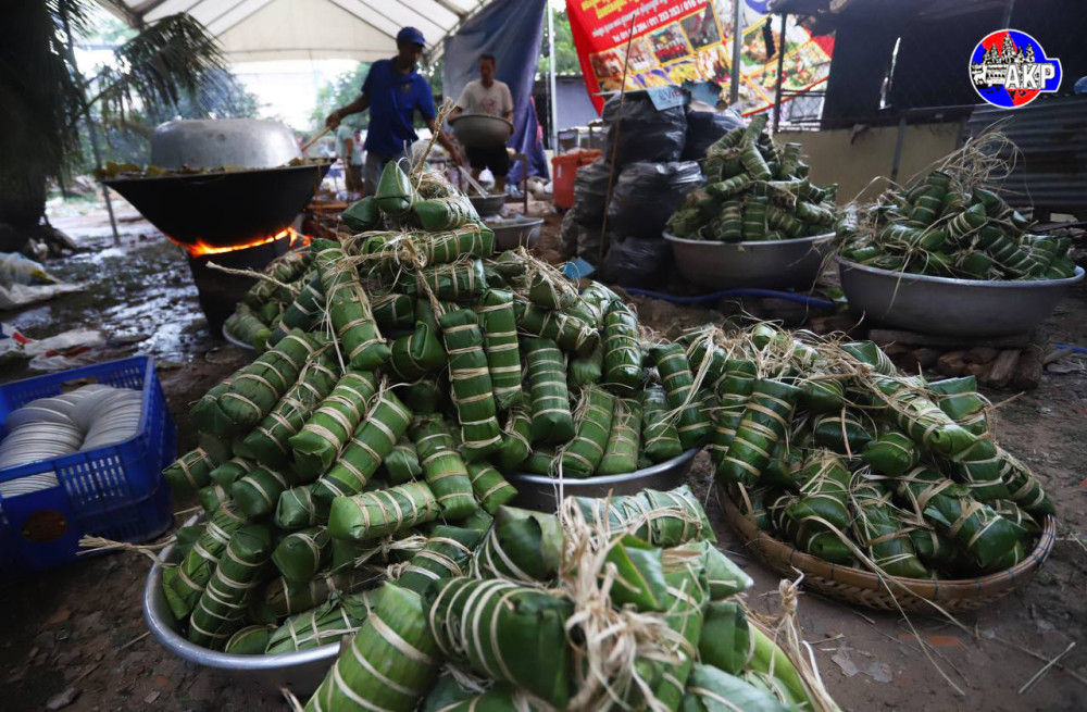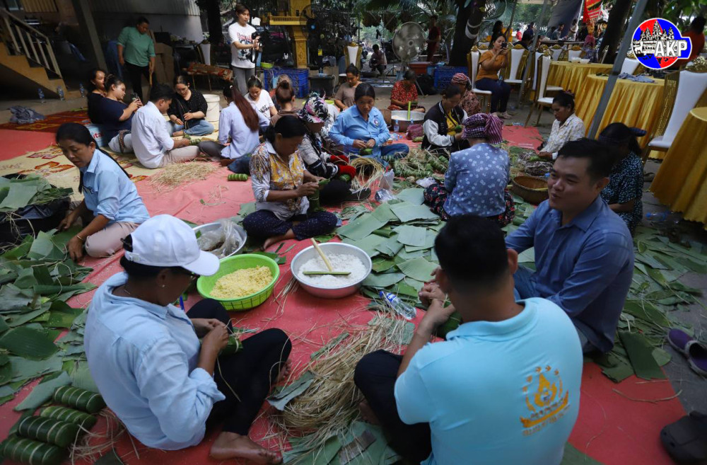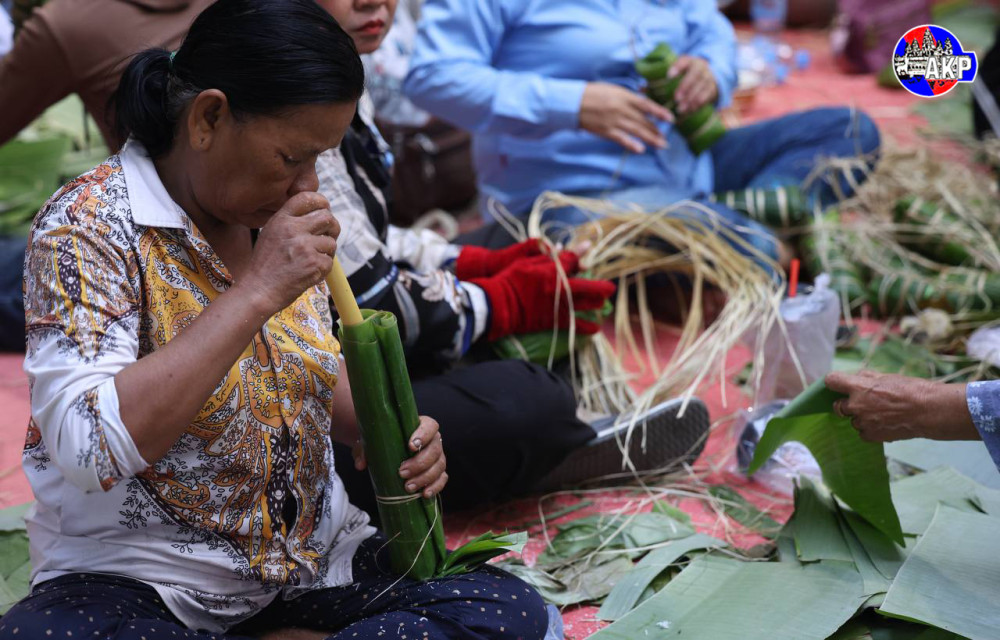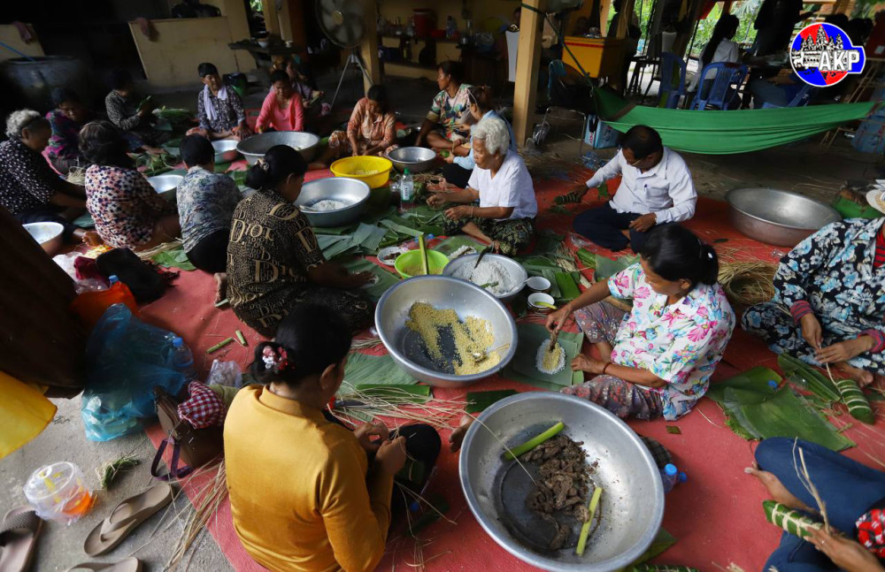 Villagers from Niroth village, Sangkat Ta Ngov Krom, Khan Chbar Ampov, Phnom Penh, gather this afternoon to cook 5,000 Num Ansorm, Cambodian sticky rice cakes, to donate to Cambodian frontline soldiers.