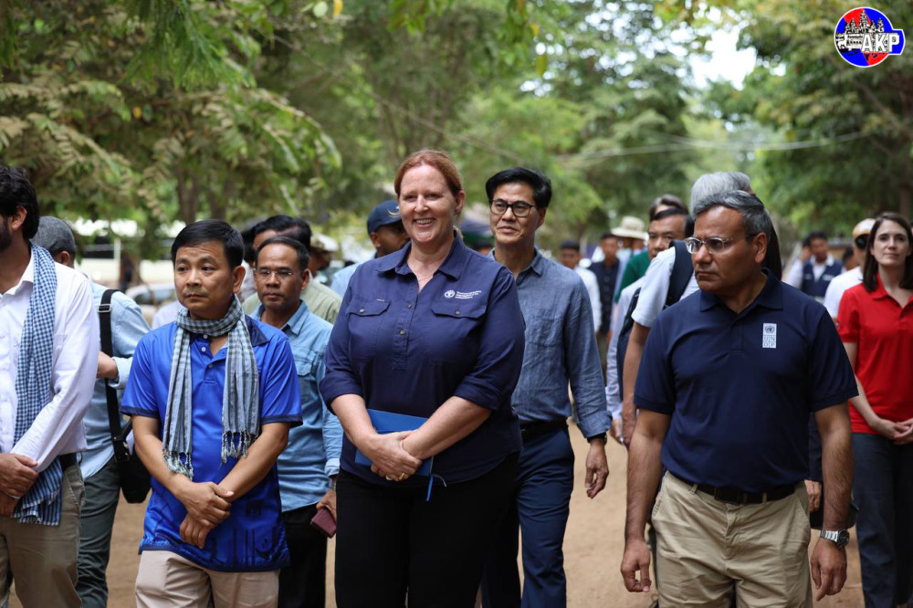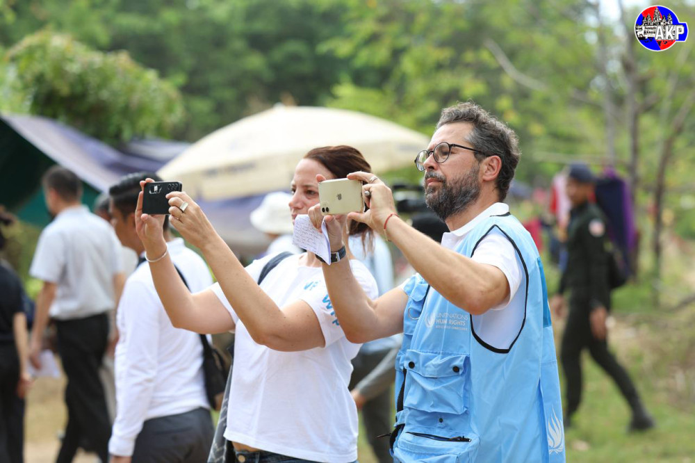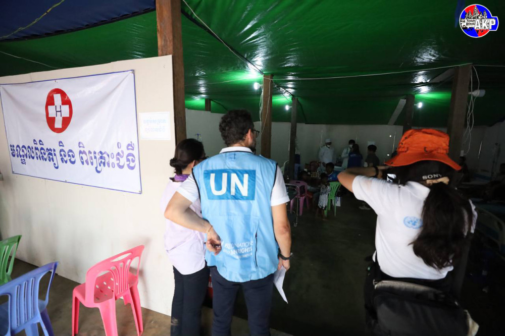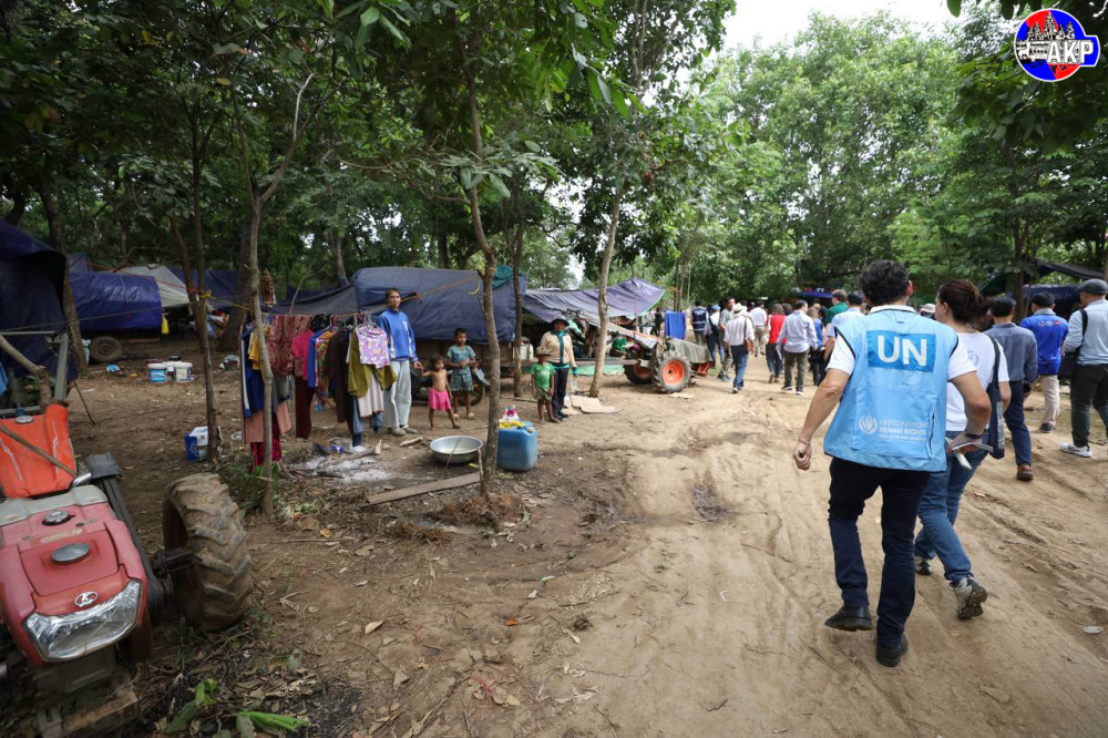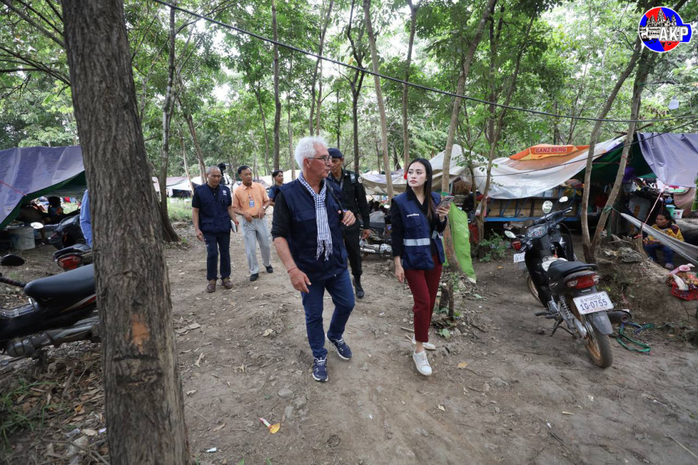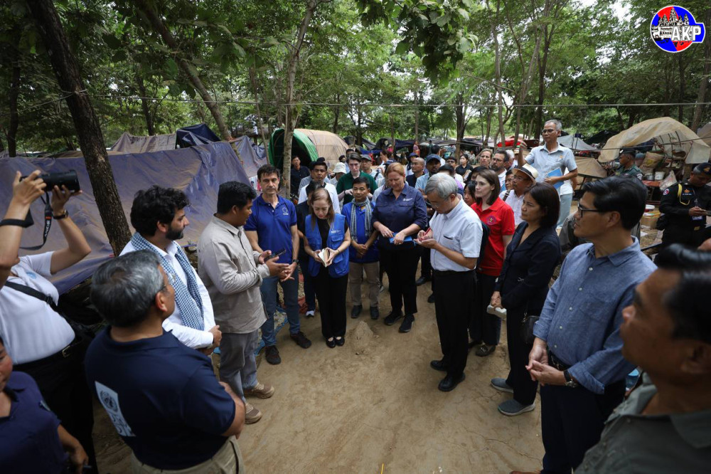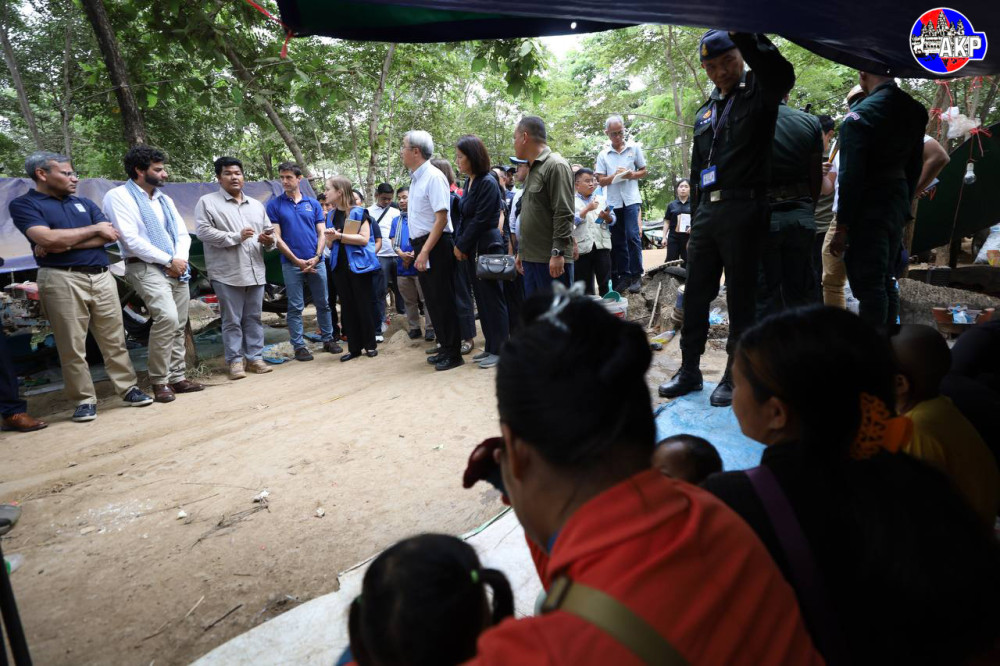 Foreign diplomats from 11 countries and representatives of 15 UN agencies, including the World Health Organisation (WHO), and other relevant organisations, conduct an on-site inspection of the displacement camp in Phnom Kambor pagoda in Banteay Ampil district, Oddar Meanchey province this afternoon.