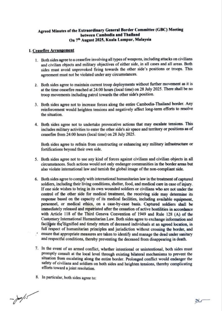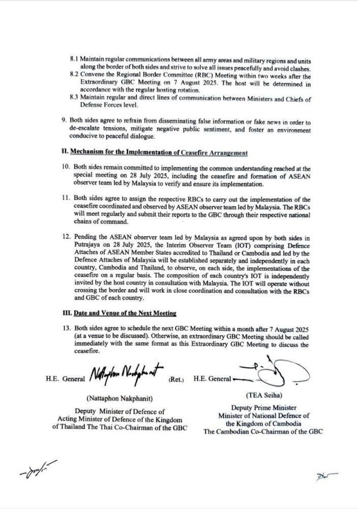 Additionally, the two sides agreed to convene a joint Regional Border Committee (RBC) meeting within two weeks; and a Cambodia–Thailand GBC meeting within one month following this extraordinary session; organize further extraordinary GBC meetings in this format if necessary.