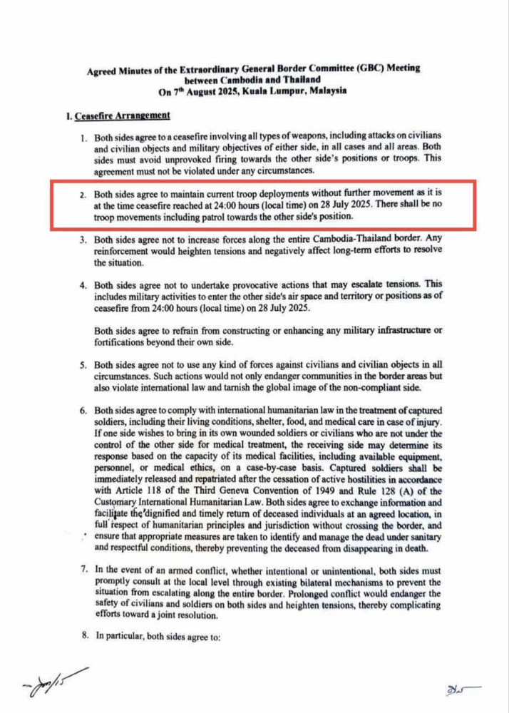 Point 2 stipulates, “Both sides agree to maintain current troop deployments without further movement as it is at the time ceasefire reached at 24:00 hours (local time) on July 28, 2025. There shall be no troop movements including patrol towards the other side's position.”