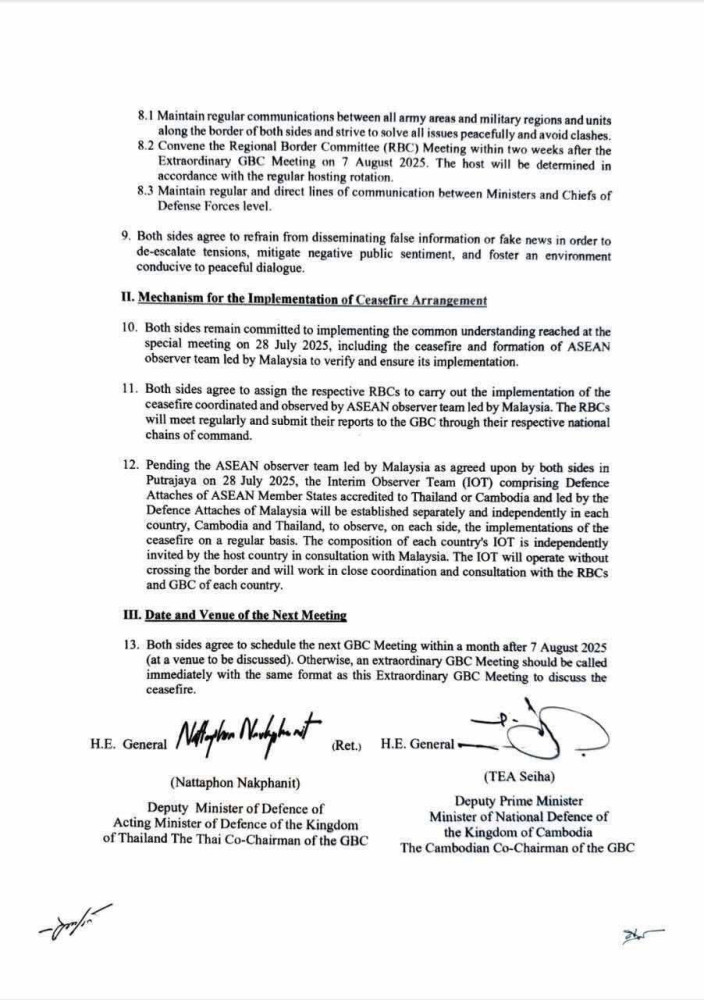 “To avoid further incidents and confusion at the frontlines, I strongly hope the Thai side will strictly implement the Agreed Minutes of the Extraordinary GBC Meeting between Cambodia and Thailand, particularly Point 2, as agreed on Aug. 7, 2025, in Kuala Lumpur,” he stressed.