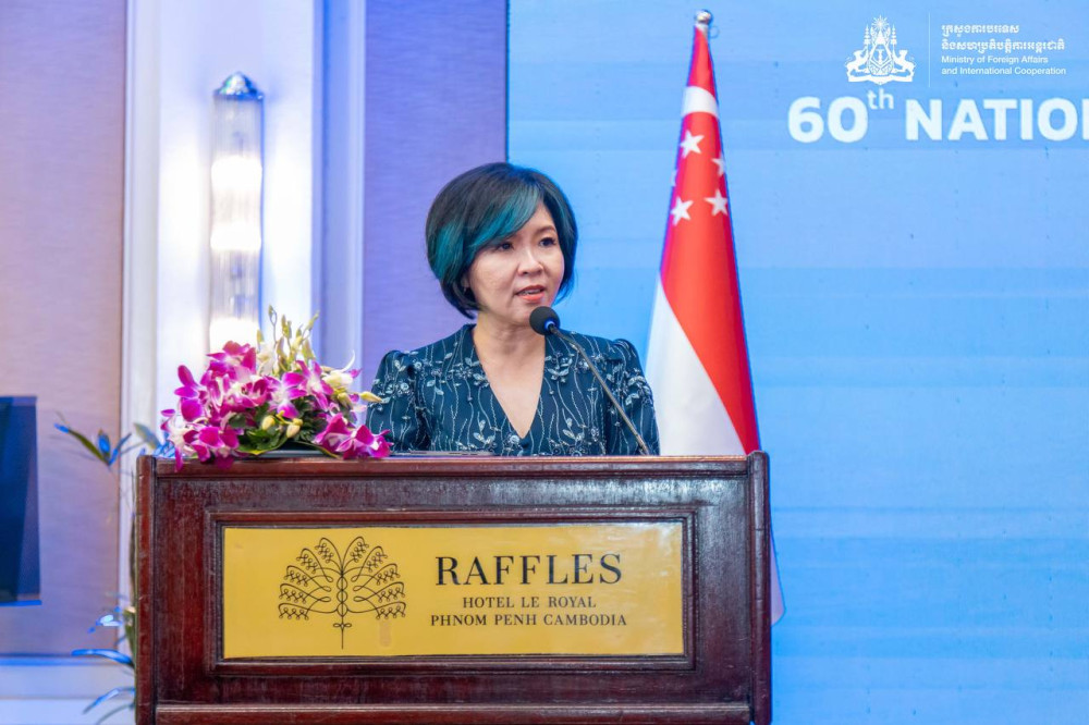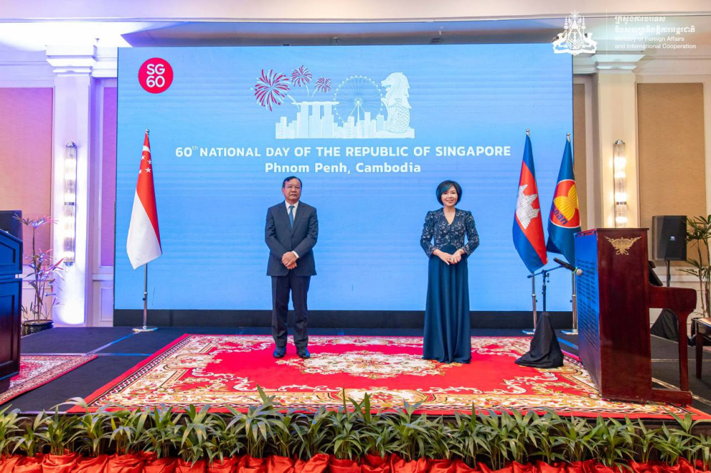 Deputy Prime Minister Prak Sokhonn (Pic. 1), Minister of Foreign Affairs and International Cooperation of Cambodia, delivers his remarks while he was participating in the celebration of the 60th Anniversary of Singapore’s National Day on Aug. 11 evening, at Raffles Le Royal Hotel in Phnom Penh.