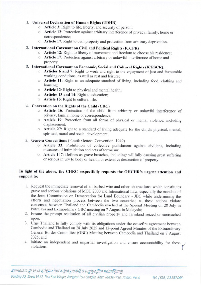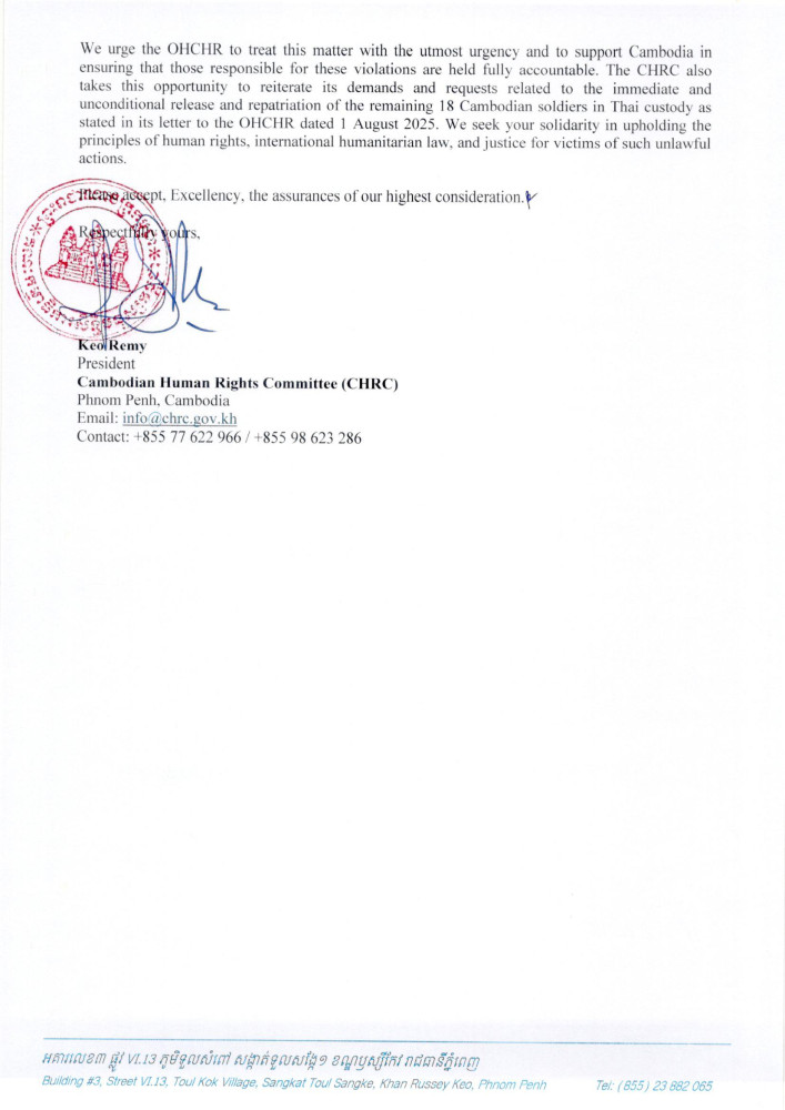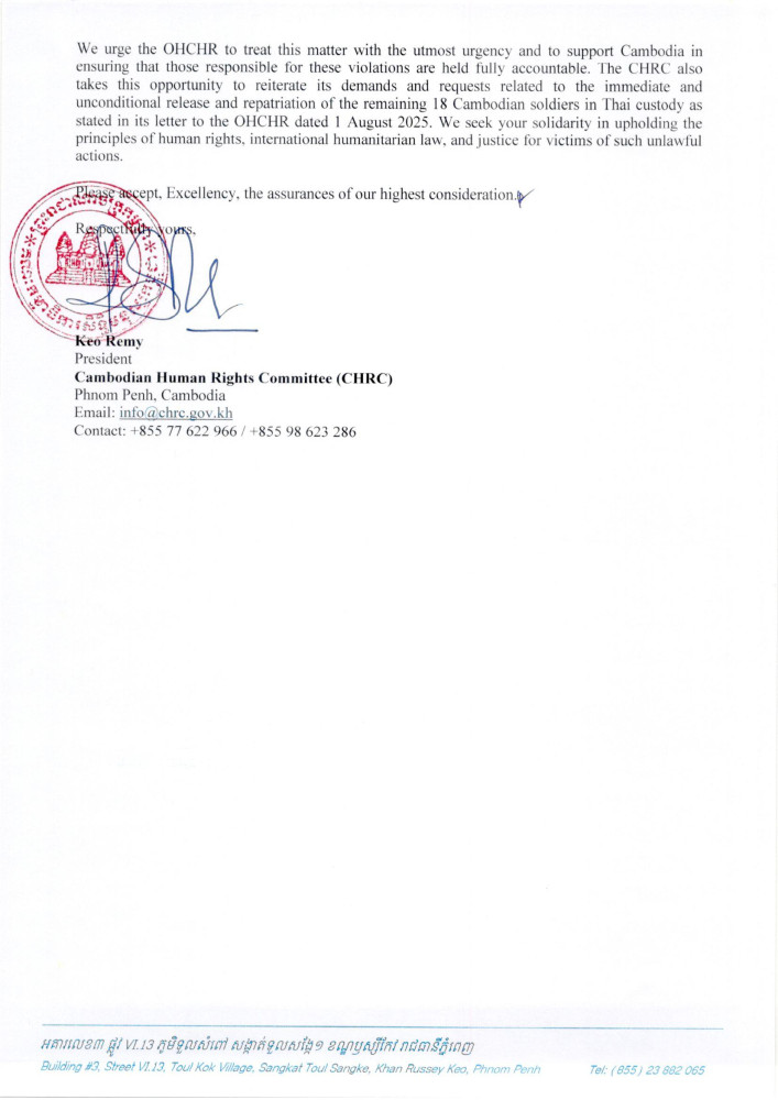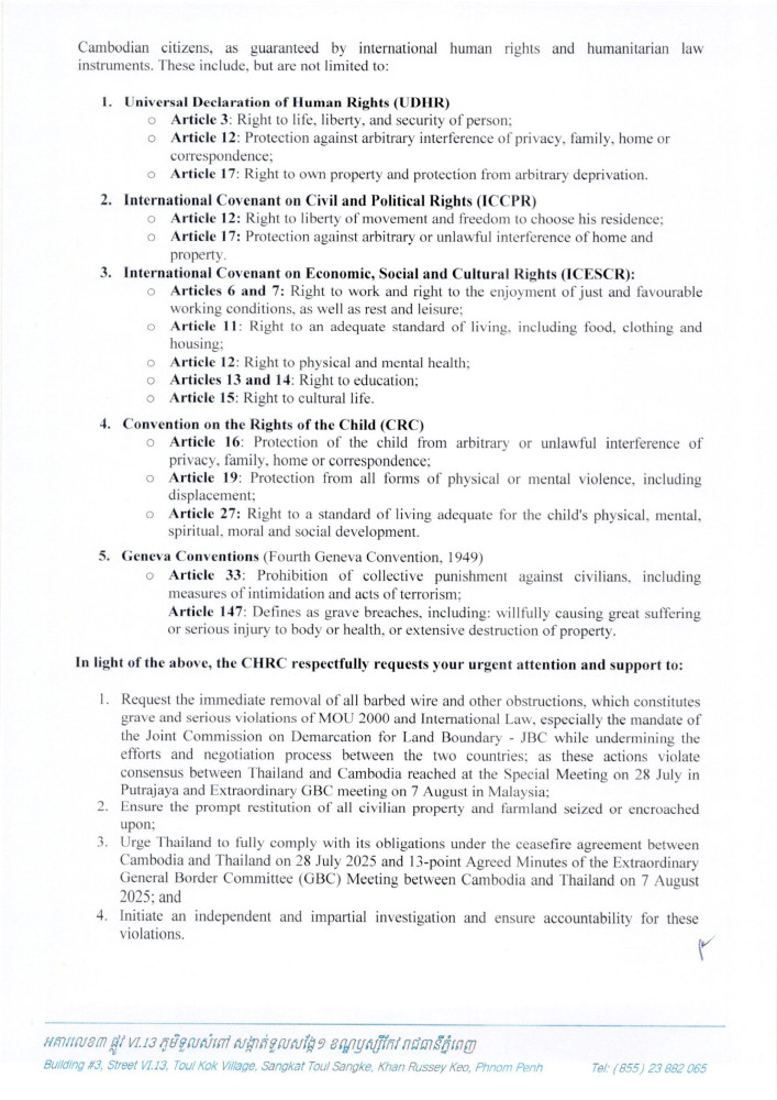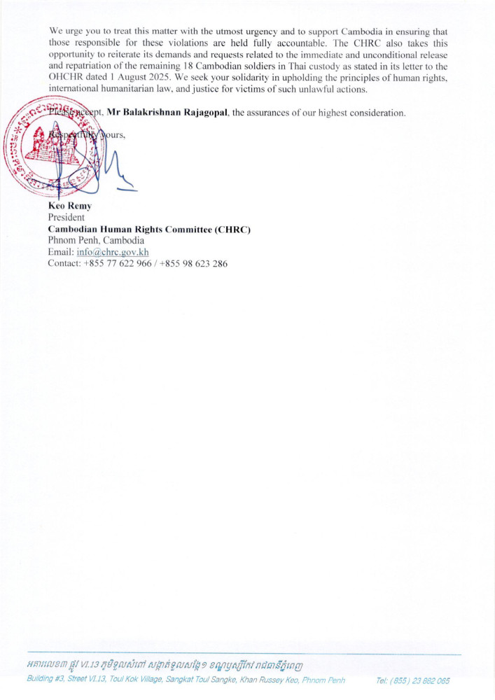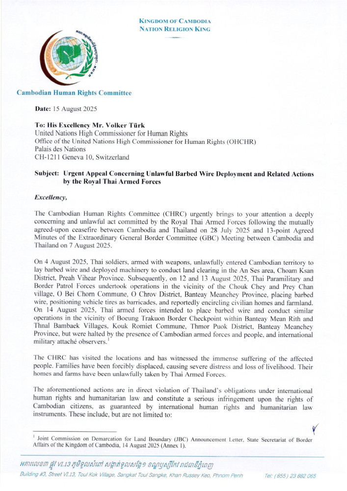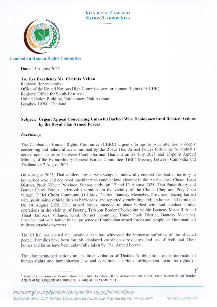 AKP Phnom Penh, August 15, 2025 -- H.E. Keo Remy, President of the Cambodian Human Rights Committee (CHRC), has lodged separate urgent appeals to the Special Rapporteur on the Rights to Adequate Housing of the Office of the United Nations High Commissioner for Human Rights (OHCHR), the United Nations High Commissioner for Human Rights, the OHCHR Regional Representative, and Chair and Representative of Malaysia at the ASEAN Intergovernmental Commission on Human Rights (AICHR) concerning unlawful barbed wire deployment and related actions by the Royal Thai Armed Forces.