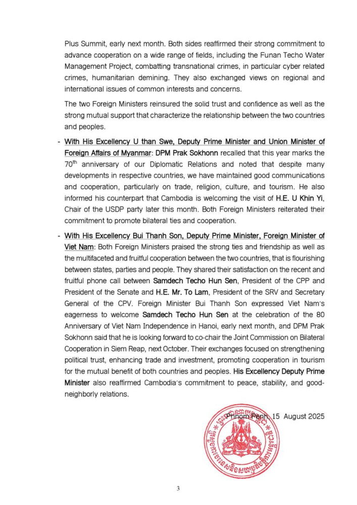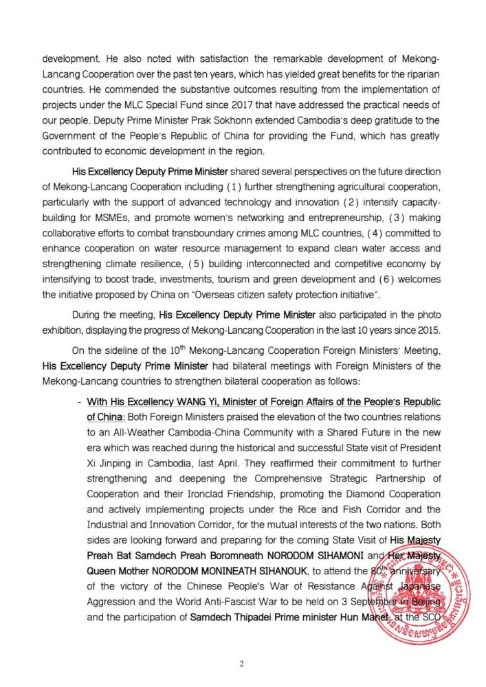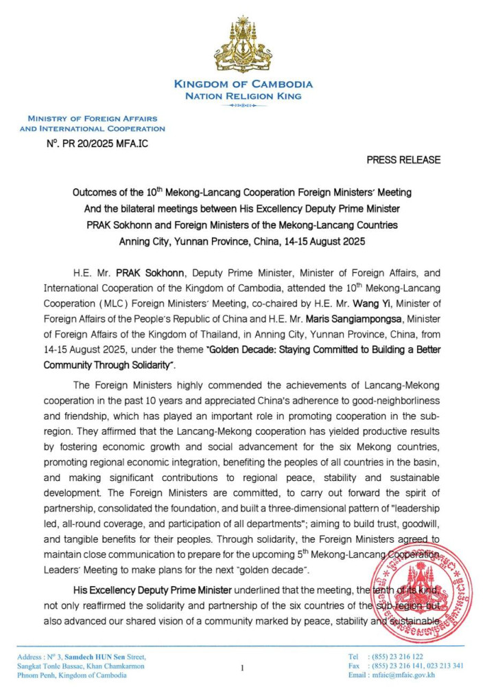 Outcomes of 10th MLC Foreign Ministers’ Meeting and Bilateral Meetings between DPM PRAK Sokhonn and MLC Foreign Ministers