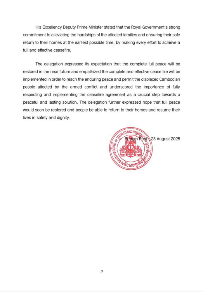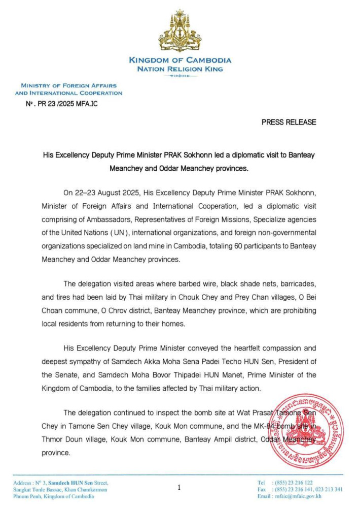 The Ministry of Foreign Affairs and International Cooperation (MFAIC) this afternoon issued a press release on the outcomes of a diplomatic visit, led by H.E. Prak Sokhonn, Deputy Prime Minister, Minister of MFAIC, to Banteay Meanchey and Oddar Meanchey provinces on Aug. 22-23, 2025.