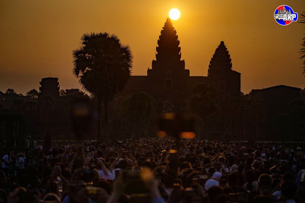 During the Equinox event, thousands of tourists gather in front of the western entrance of the Angkor Wat Temple waiting to witness and take photos of the marvelous sunrise.