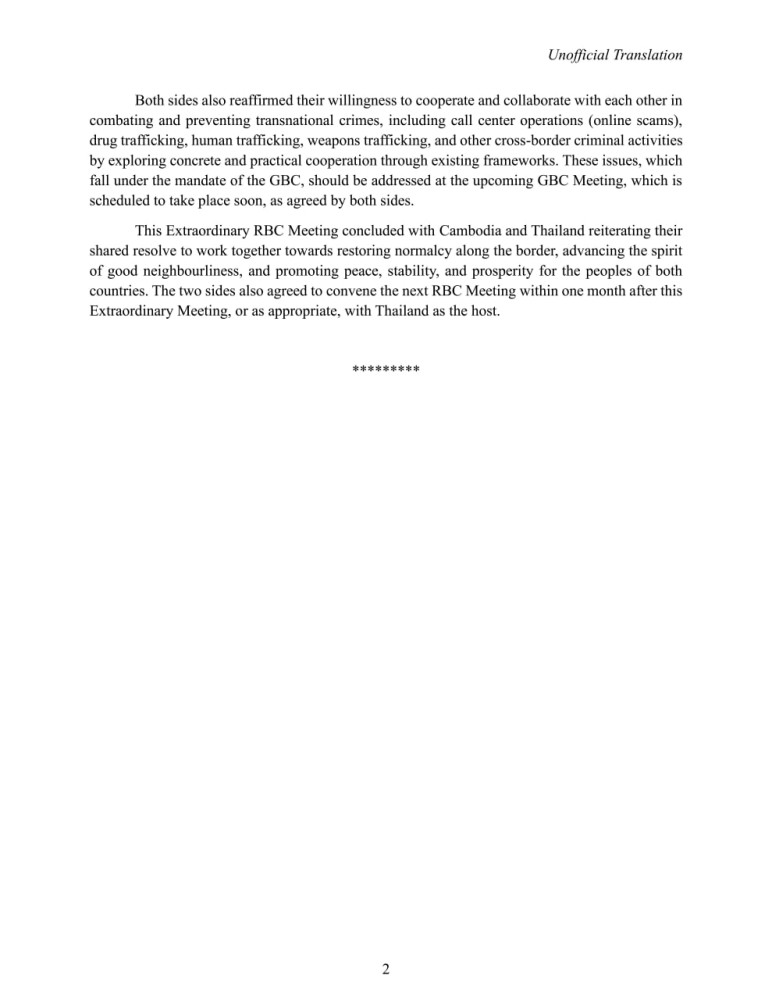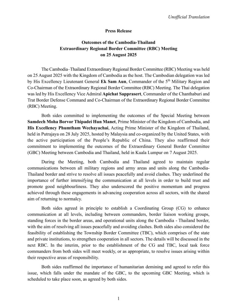 The following are the outcomes of the Cambodia-Thailand Extraordinary Regional Border Committee (RBC) Meeting, released by the Royal Cambodian Army, following the meeting in Pailin province this morning: