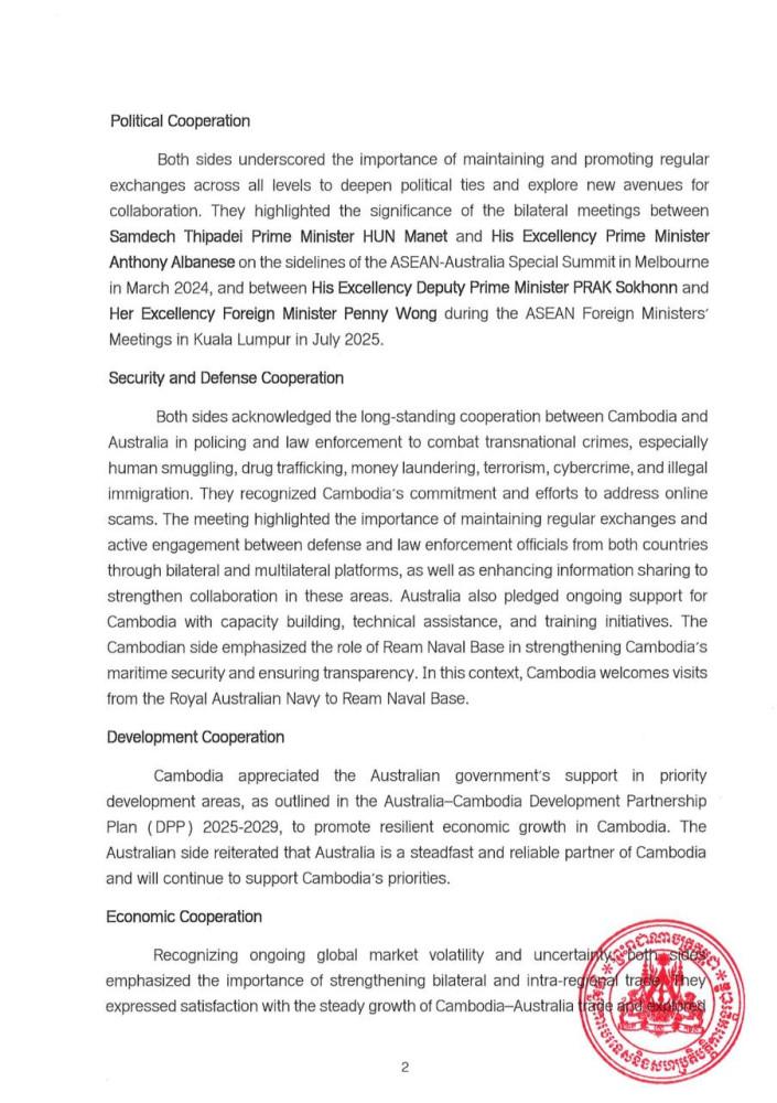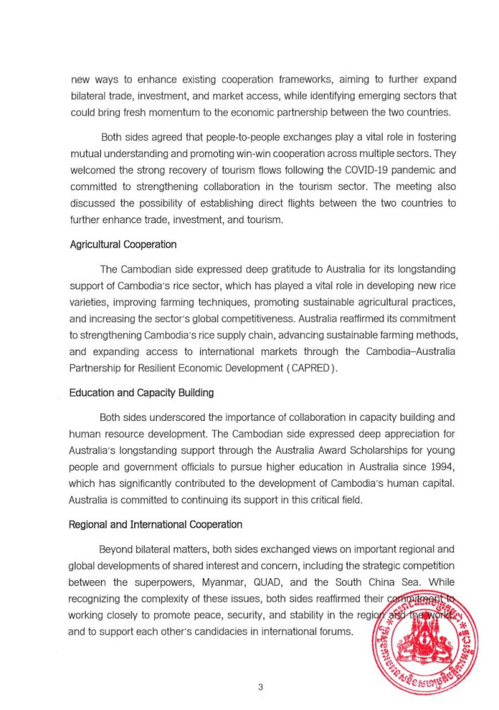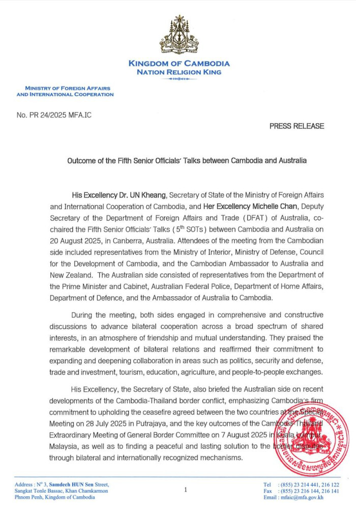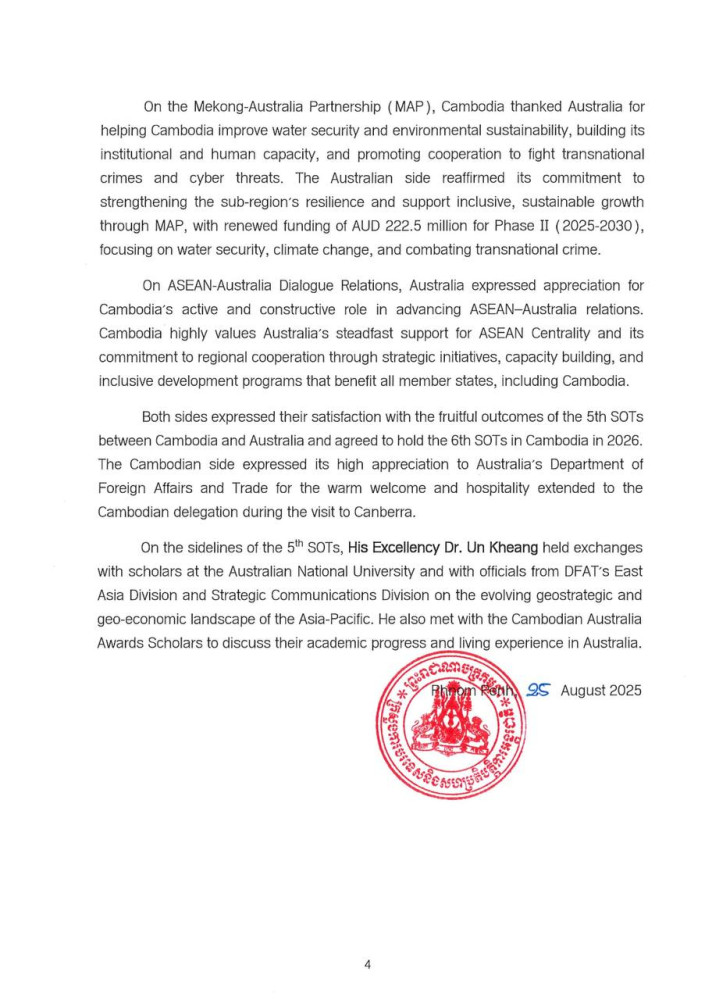 Outcome of Fifth Senior Officials' Talks between Cambodia and Australia