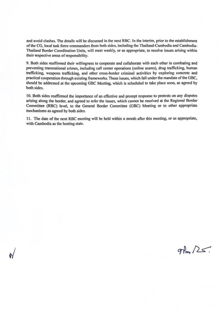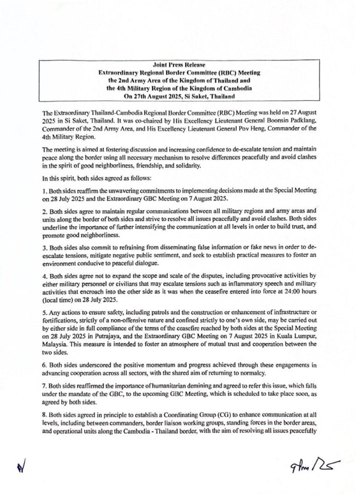 The following is the Joint Press Release on the Outcomes of the Extraordinary Meeting of the Regional Border Committee (RBC) between the 4th Military Region of the Kingdom of Cambodia and the 2nd Army Area of the Kingdom of Thailand, held on Aug. 27, 2025: