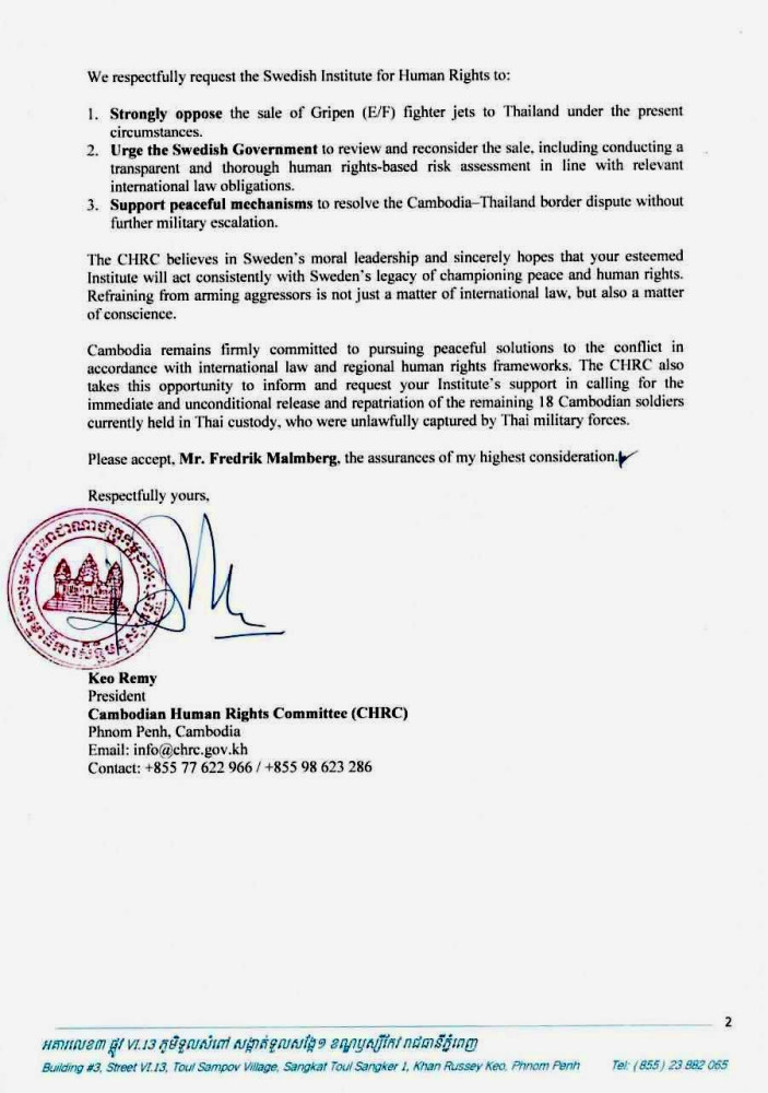 Cambodian Human Rights Committee (CHRC) has sent a letter to the Swedish Institute for Human Rights, requesting the latter to urge the Swedish Government to review Griper (E/F) fighter jet sale to Thailand to uphold human rights principles.