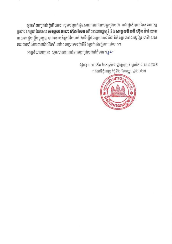 AKP Phnom Penh, September 02, 2025 -- The Royal Government Spokesperson has categorically rejected false information posted on the Facebook account of self-exiled opposition figure Sam Rainsy, who accused Samdech Akka Moha Sena Padei Techo Hun Sen, President of the Senate, of involvement with Bangchak, a leading Thai energy conglomerate.