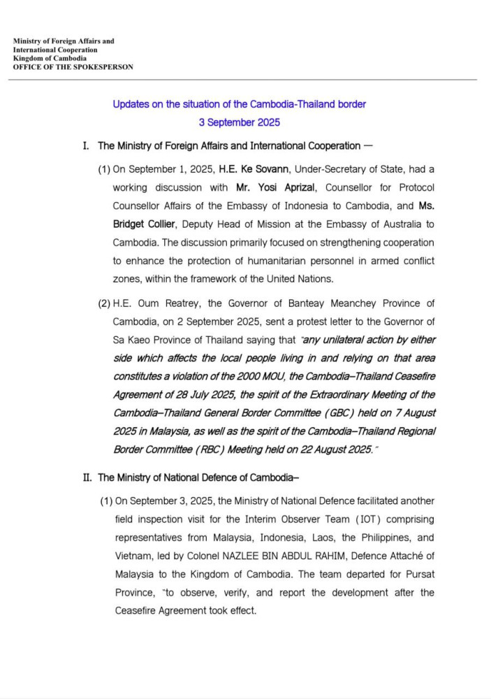 Updates on Situation along Cambodia-Thailand Border on Sept. 03, 2025