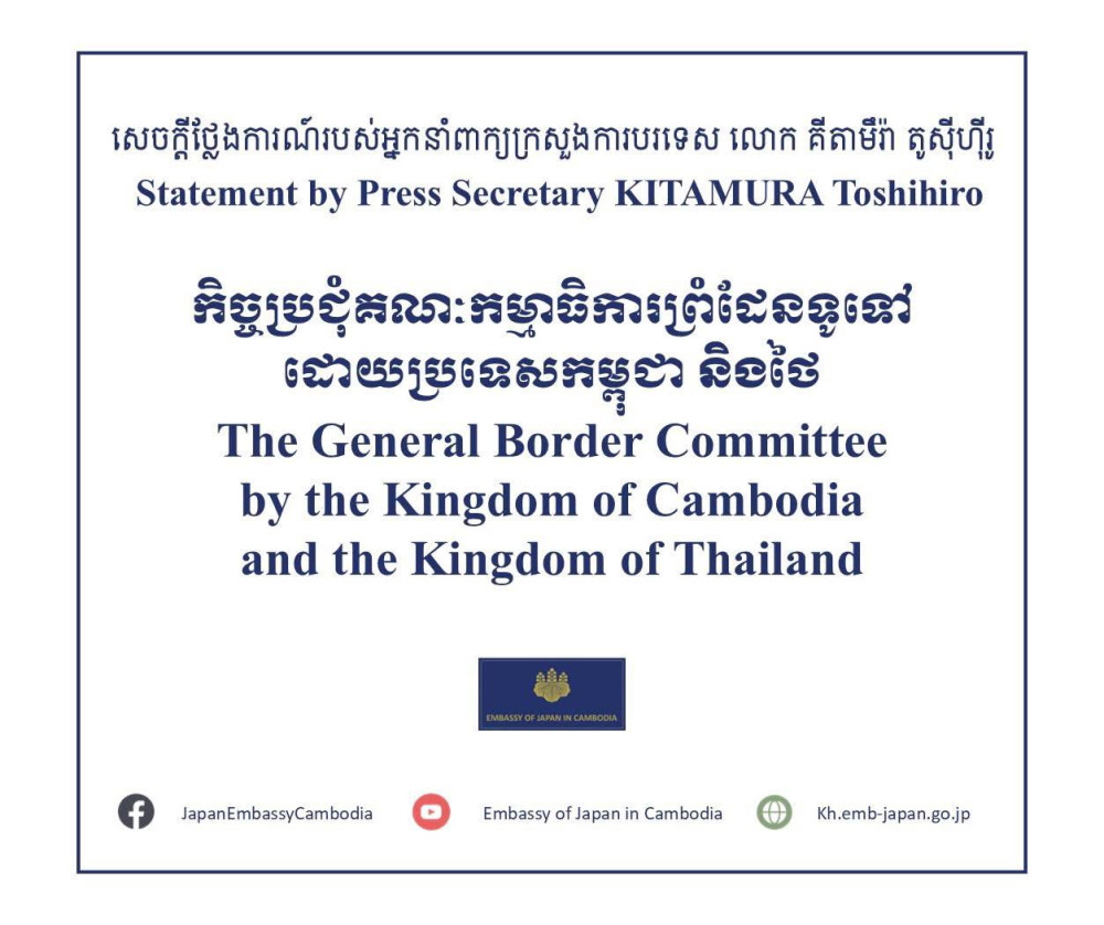 “Japan welcomes that Cambodia and Thailand held the General Border Committee on Sept. 10 with progress in discussions regarding the establishment of the ASEAN Observer Team, demining and resumption of cross-border logistics, which represents an important outcome to advance the ceasefire agreement between the two countries,” read a statement by Press Secretary KITAMURA Toshihiro AKP received this evening.