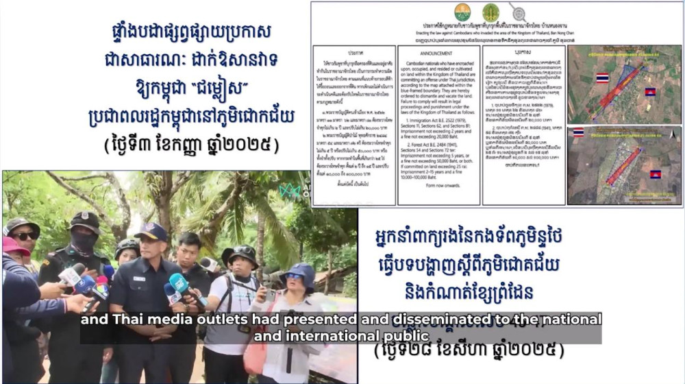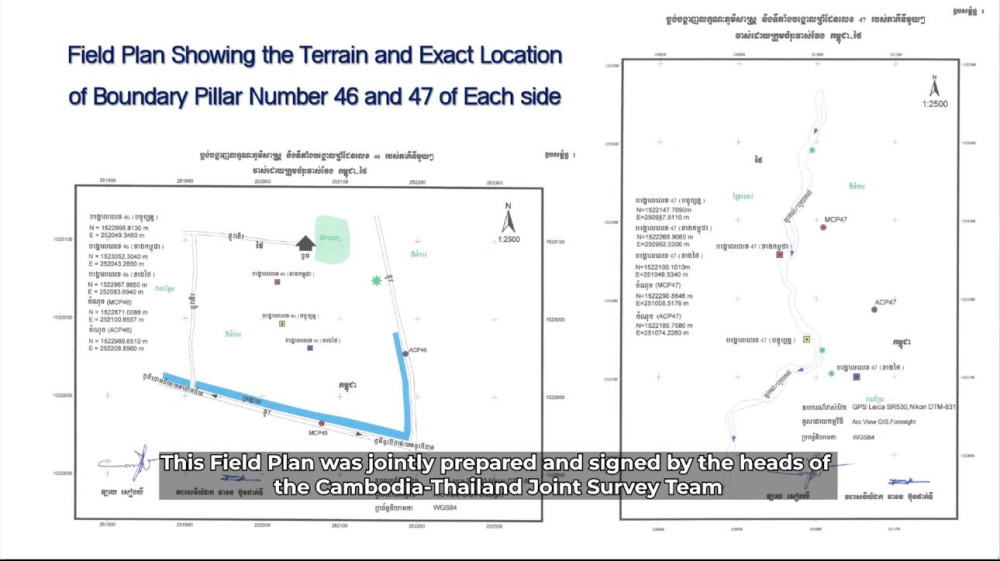 In a televised statement, Maj. Gen. Chheng Khun, Deputy Director of the Department of Geography at the Ministry of National Defence, stressed that the maps and satellite images presented by Thailand—showing red and blue boundary lines—are unilaterally drawn and not mutually agreed. The “Field Plan” signed by both survey teams only indicates the locations of boundary pillars, not the official boundary line.