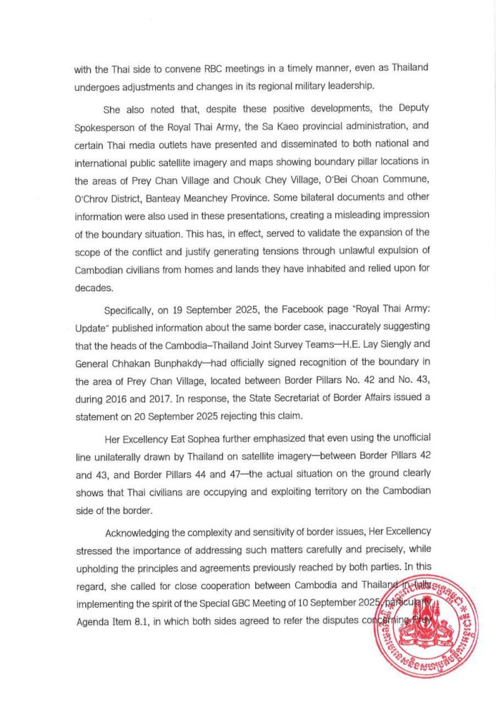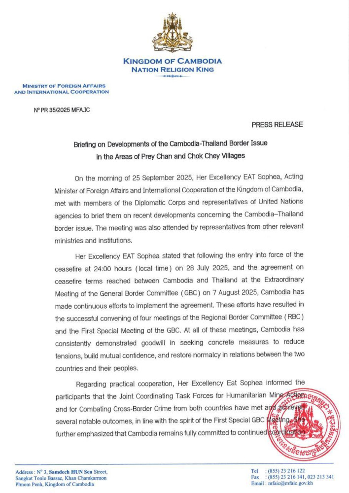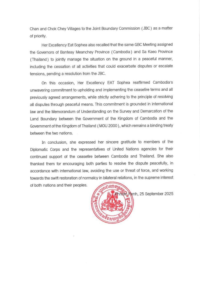 H.E. Ms. Eat Sophea, Acting Minister of Foreign Affairs and International Cooperation (MFAIC), this morning briefed members of the Diplomatic Corps and representatives of UN agencies on developments of the Cambodia-Thailand border issue in the areas of Prey Chan and Chok Chey villages in O’ Bei Choan commune, O’ Chrov district, Banteay Meanchey province.