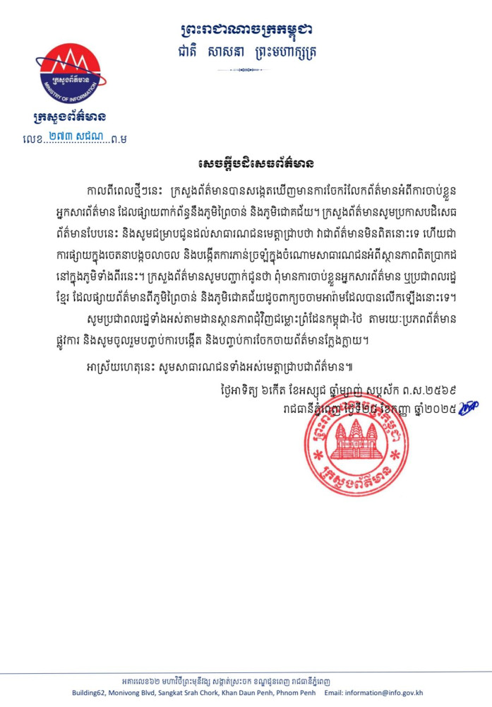 The Ministry of Information this morning reaffirmed that no journalists have been arrested in connection with recent tensions along the Cambodian-Thai border, particularly in the case of Prey Chan and Chork Chey villages.