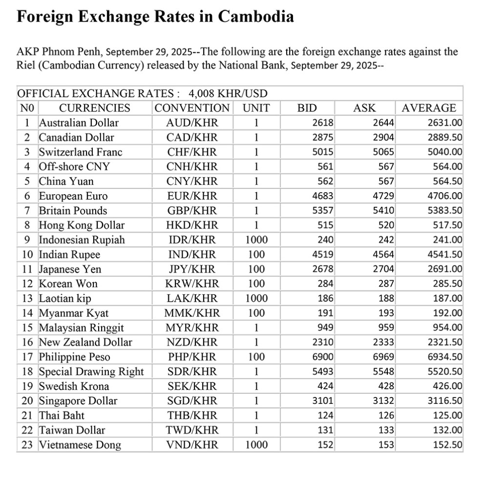 AKP Phnom Penh, September 29, 2025--The following are the foreign exchange rates against the Riel (Cambodian Currency) released by the National Bank, September 29, 2025--