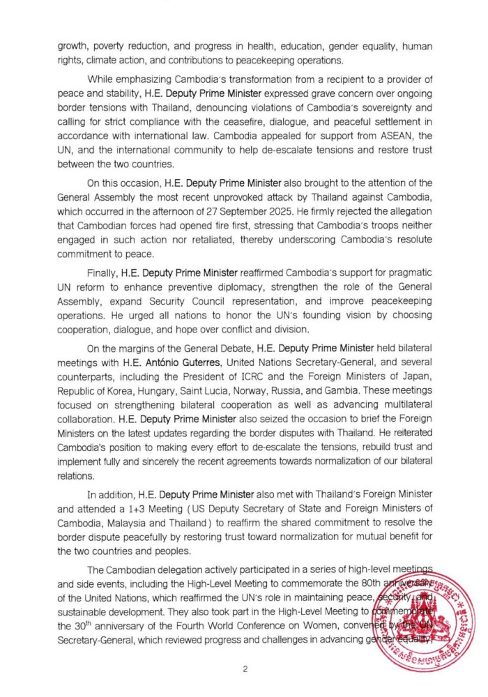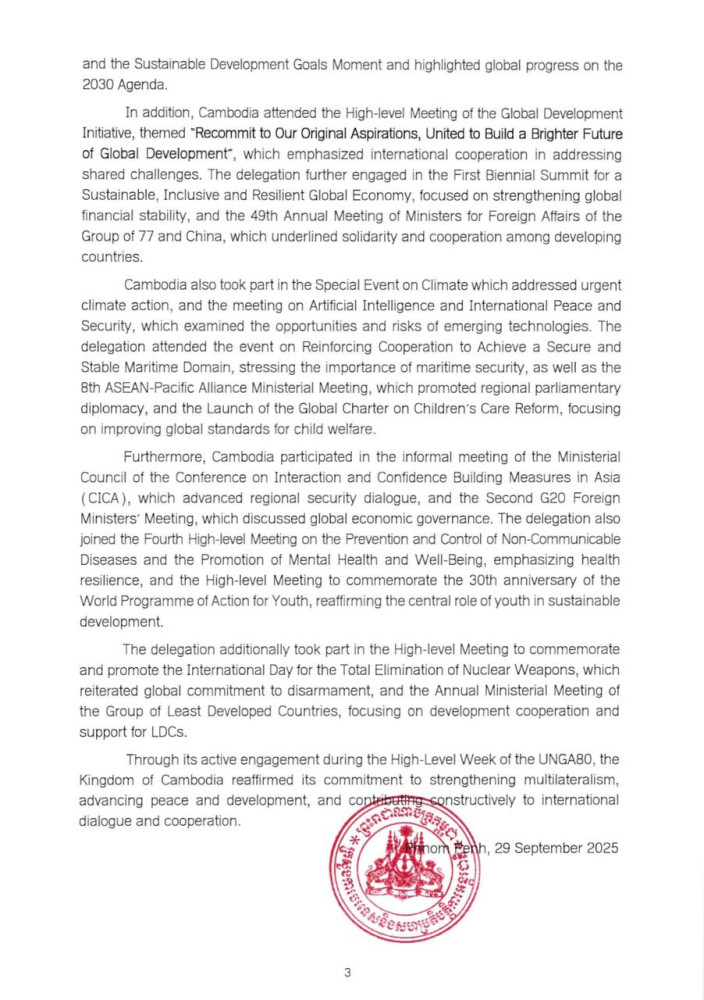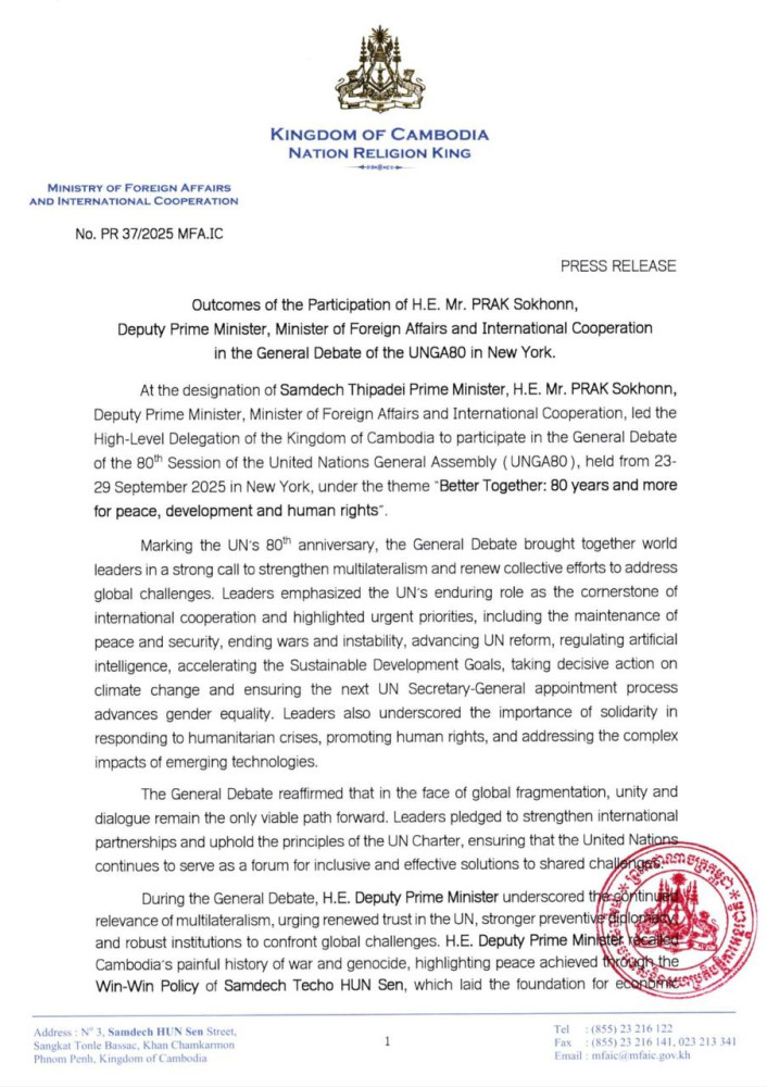 The following are the outcomes of the participation of Deputy Prime Minister and Minister of Foreign Affairs and International Cooperation H.E. PRAK Sokhonn in the General Debate of the 80th Session of the United Nations General Assembly (UNGA 80), held from Sept. 23 to 29 in New York: