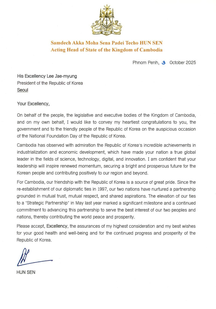 Samdech Techo Hun Sen Congratulates the Republic of Korea on National Foundation Day