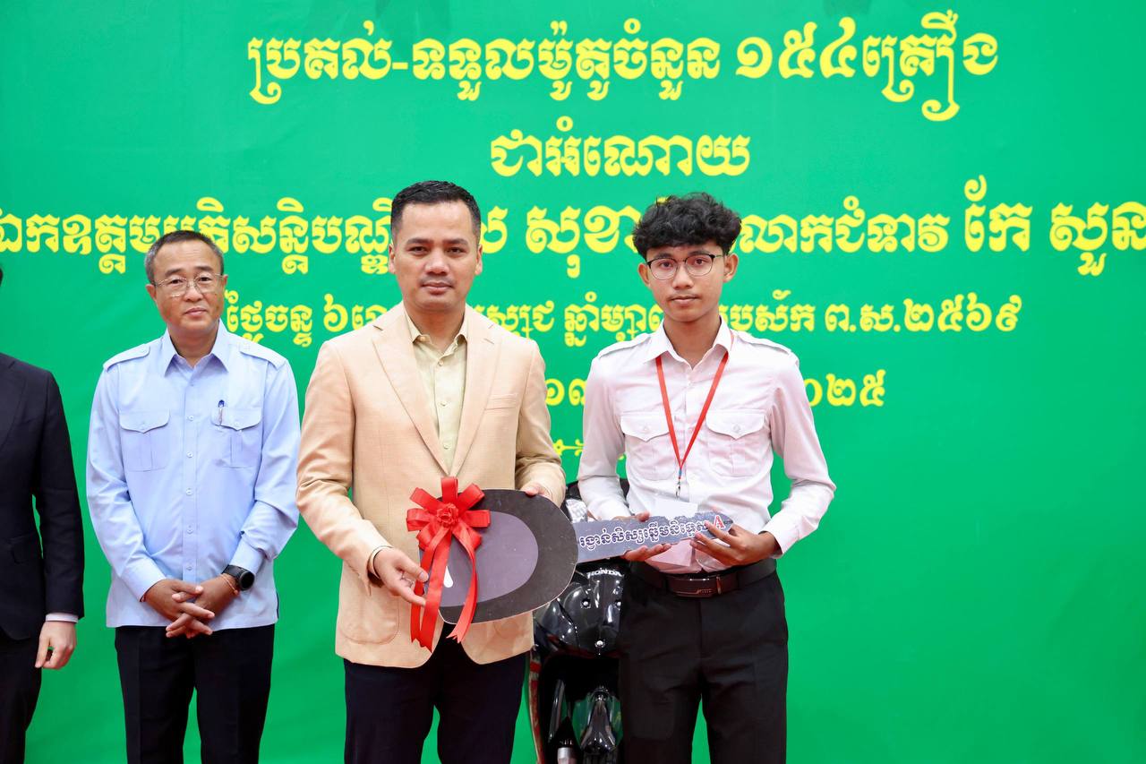 In a gesture of recognition, the Deputy Prime Minister awarded each Grade A student a motorcycle, cash aid, and educational supplies. He also extended financial support and resources to volunteer teachers offering free tutoring to Grade 12 students in the 2024–2025 school year, plus incentives for principals at the 27 Prey Veng high schools producing these high achievers.