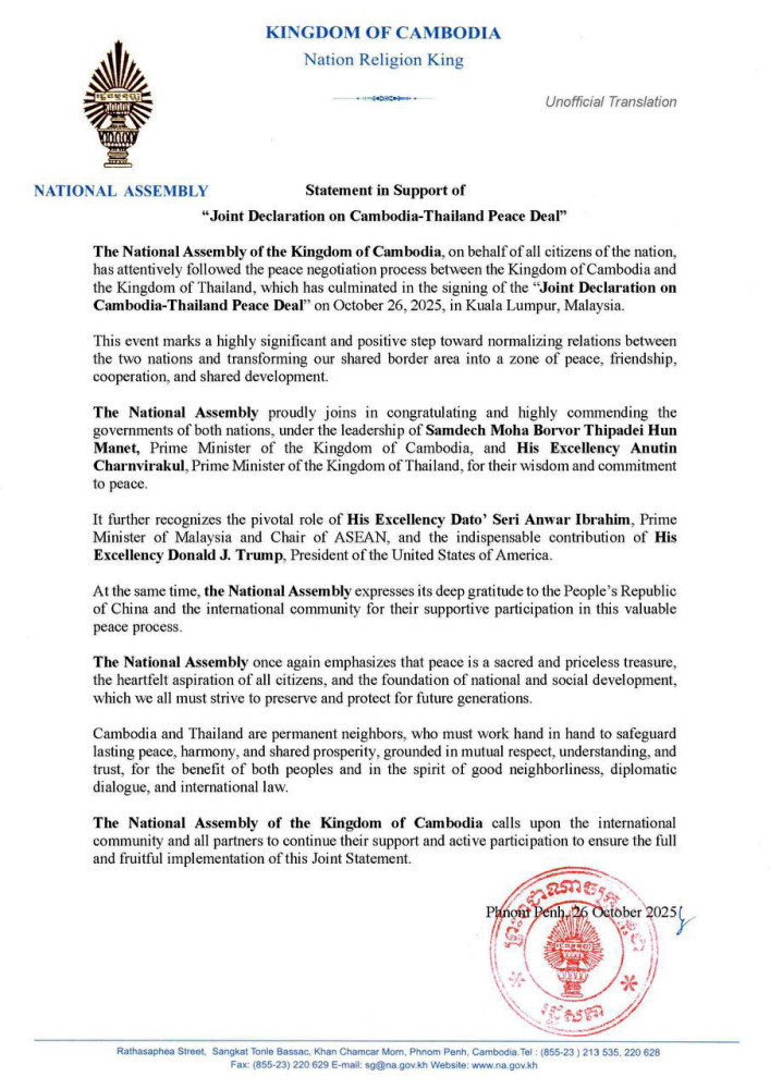 The National Assembly of Cambodia this afternoon issued a Statement of Support of the “Joint Declaration on Cambodia-Thailand Peace Deal,” signed today in Kuala Lumpur, Malaysia.