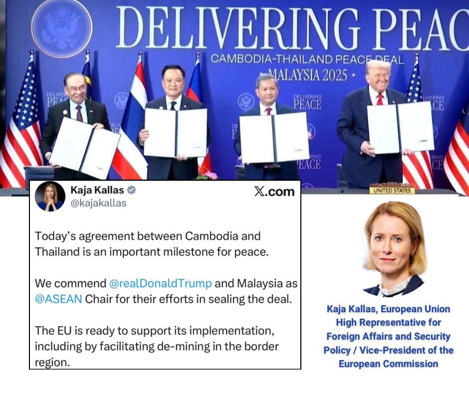 The EU High Representative and Vice-President of the European Commission, H.E. Ms. Kaja Kallas, welcomed today’s agreement between Cambodia and Thailand, underlining that it is an important milestone for peace.