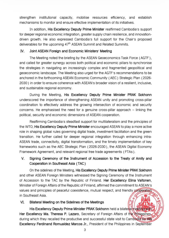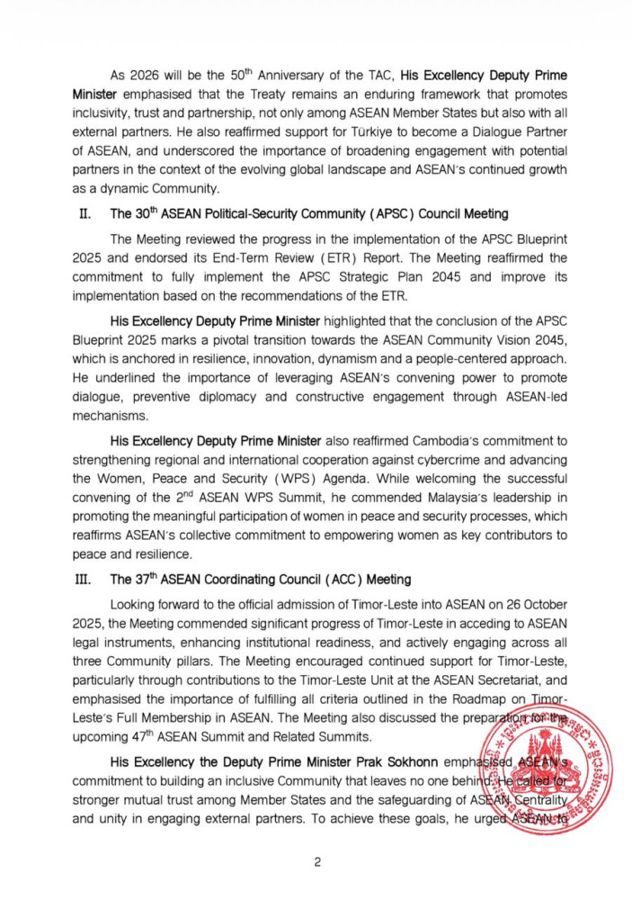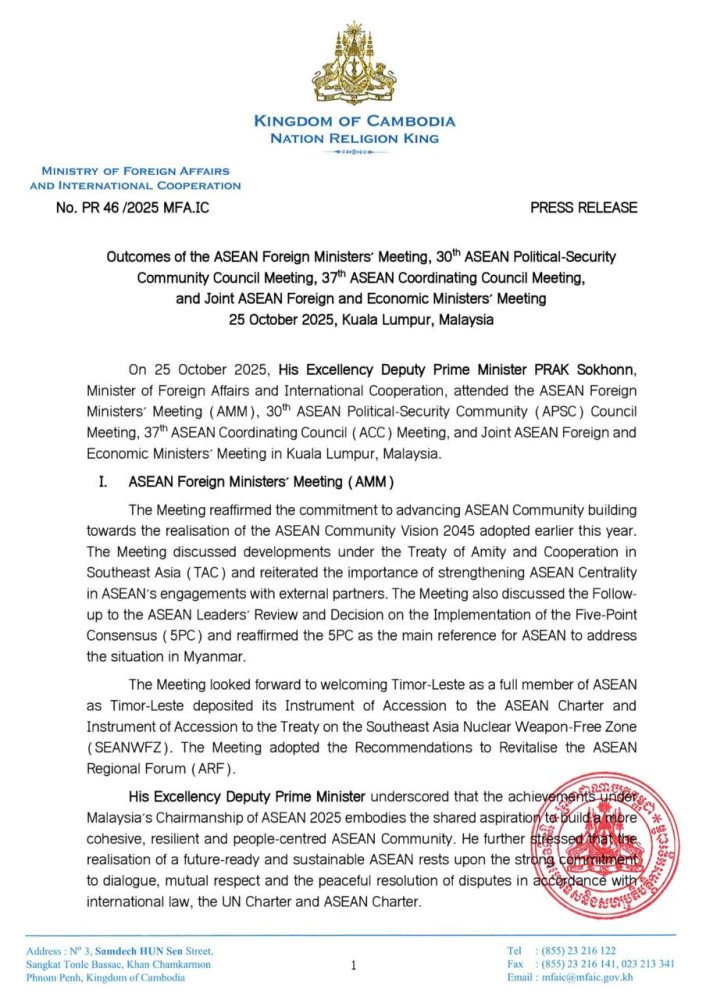 The following are the outcomes of the ASEAN Foreign Ministers’ Meeting (AMM), 30th ASEAN Political-Security Community (APSC) Council Meeting, 37th ASEAN Coordinating Council (ACC) Meeting, and Joint ASEAN Foreign and Economic Ministers’ Meeting, released on Oct. 26 by the Cambodian Ministry of Foreign Affairs and International Cooperation: