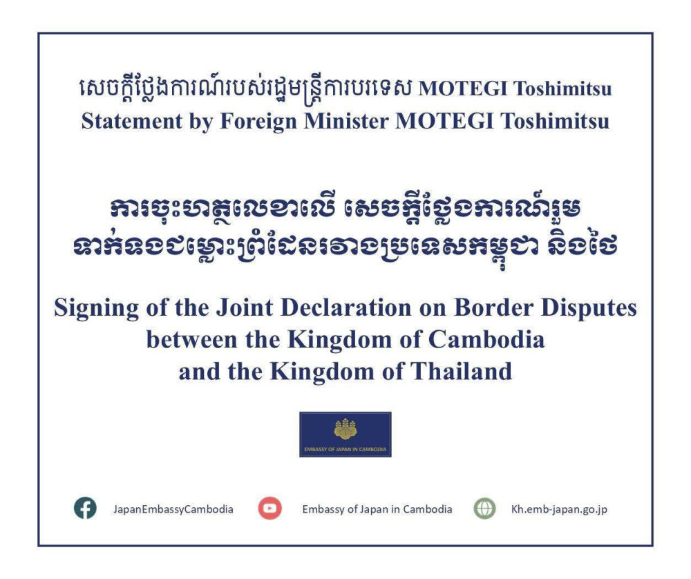 Japanese Foreign Minister H.E. MOTEGI Toshimitsu this evening issued a statement, welcoming the recent signing of the Joint Declaration on border conflict between Cambodia and Thailand in Malaysia.