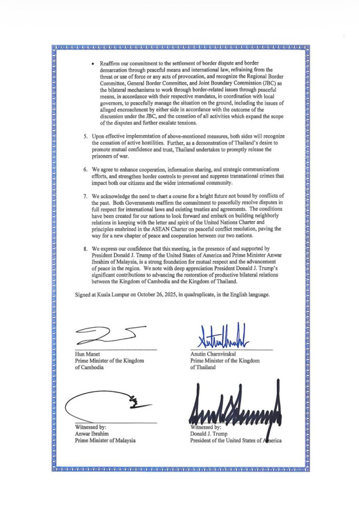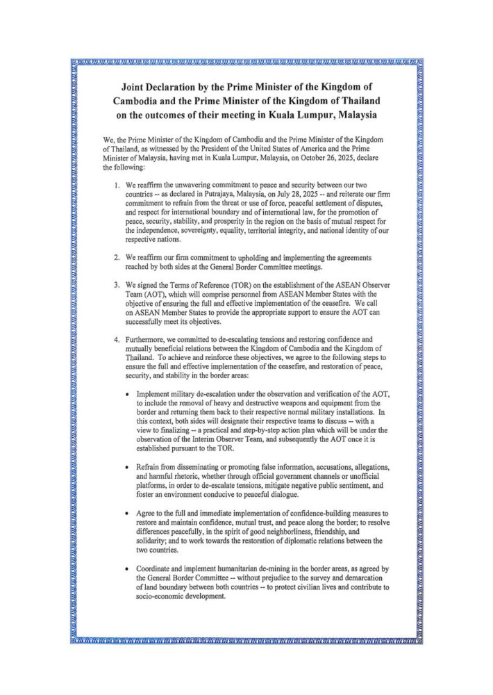 Joint Declaration by Cambodian and Thai Prime Ministers on Outcomes of Their Meeting in Kuala Lumpur