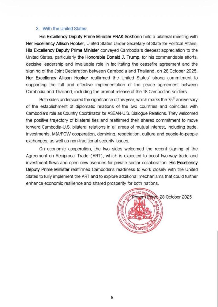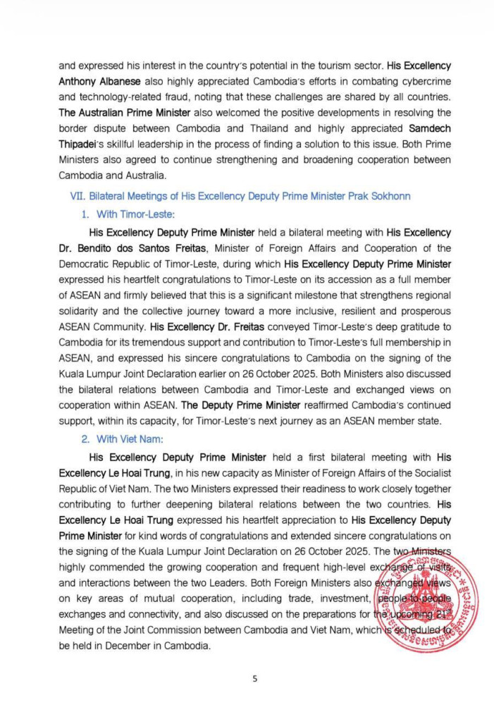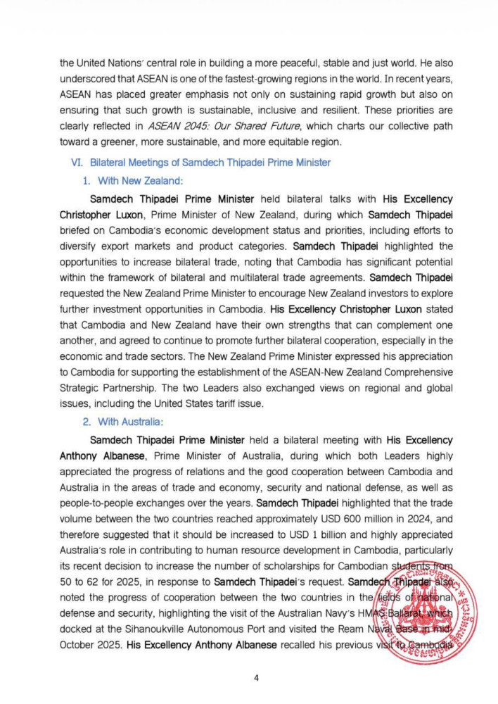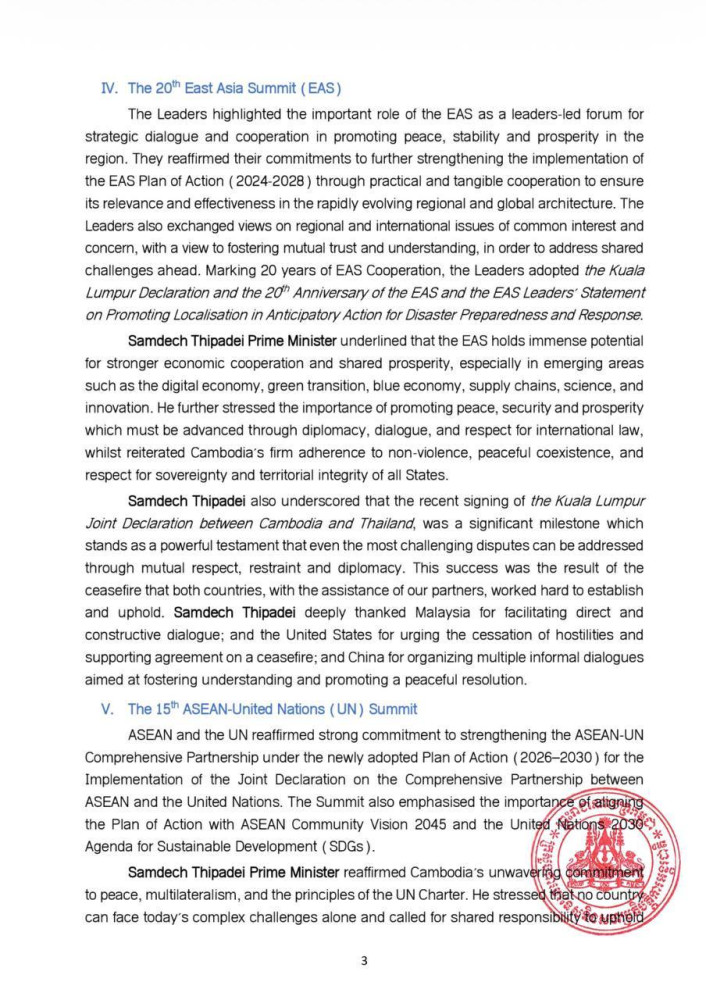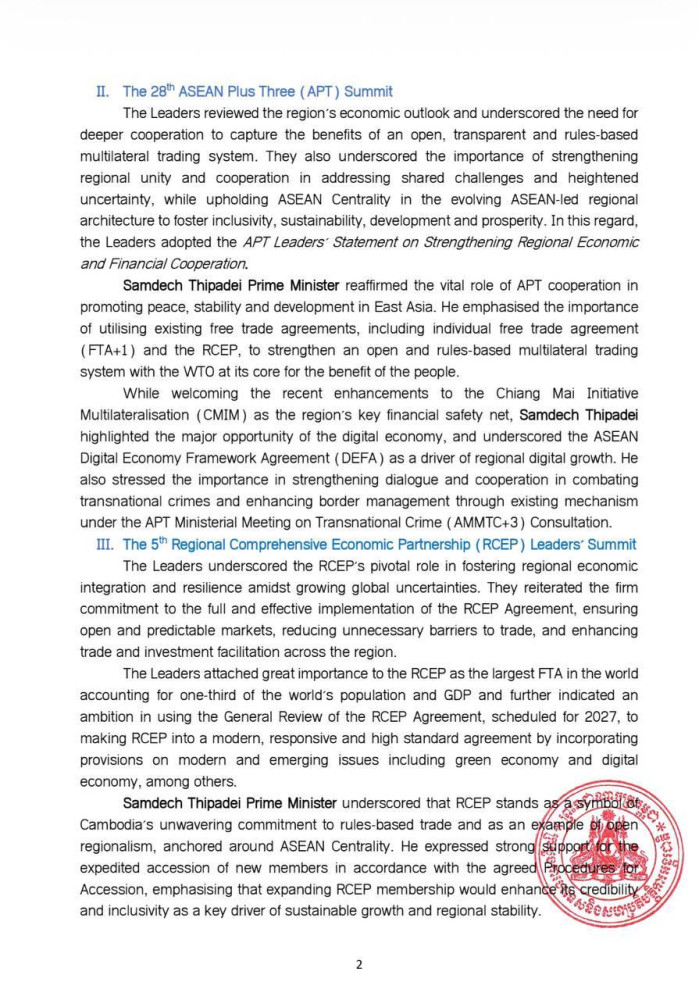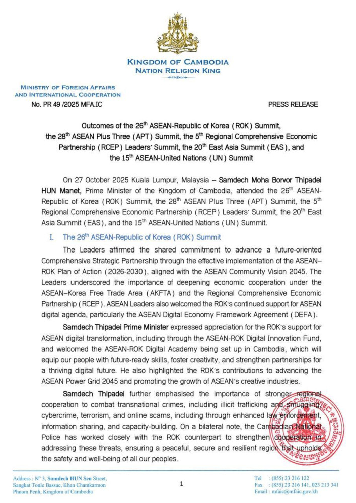 AKP Phnom Penh, October 28, 2025 -- The following are the outcomes of the 26th ASEAN-Republic of Korea (ROK) Summit, the 28th ASEAN Plus Three (APT) Summit, the 5th Regional Comprehensive Economic Partnership (RCEP) Leaders' Summit, the 20th East Asia Summit (EAS), and the 15th ASEAN-United Nations (UN) Summit: