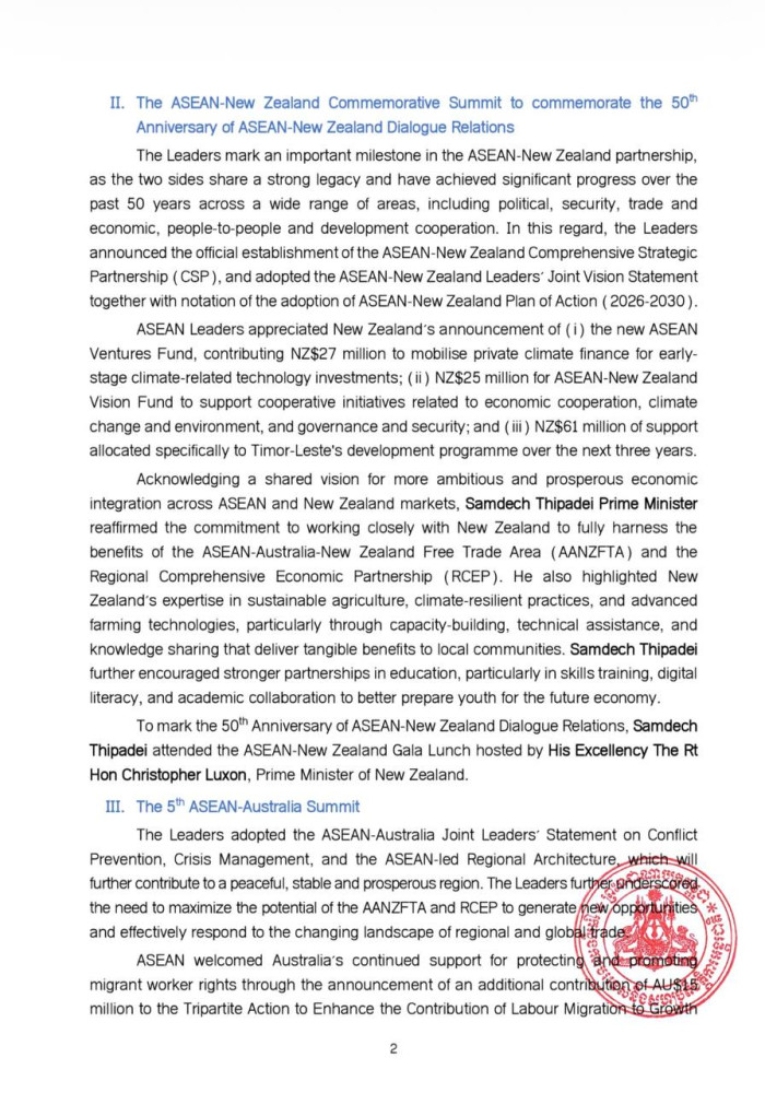 The following are the outcomes of the 28th ASEAN-China Summit, ASEAN-New Zealand Commemorative Summit, and 5th ASEAN-Australia Summit, released this morning by the Ministry of Foreign Affairs and International Cooperation: