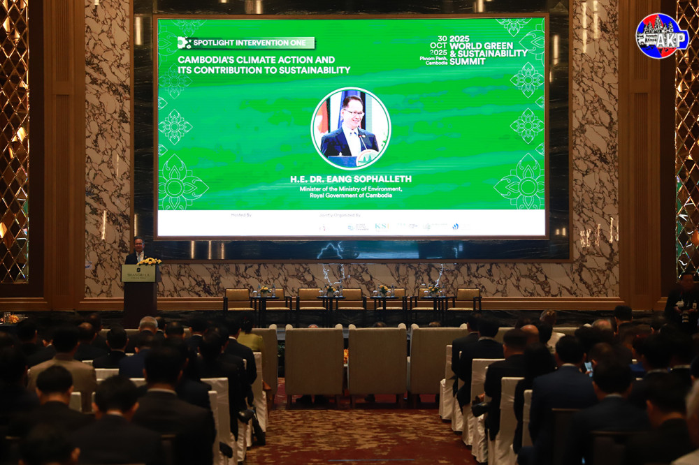 H.E. Eang Sophalleth (Pic. 1), Minister of Environment of the Kingdom of Cambodia, presents his intervention report on Cambodia’s Climate Action and its Contribution to Sustainability at the 2025 World Green and Sustainability Summit, held at Shangri-La Hotel, Phnom Penh this morning.
