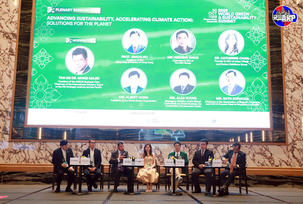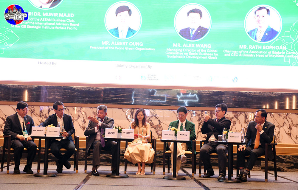 The Plenary Session 1 under the theme “Advancing Sustainability, Accelerating Climate Action: Solutions for the Planet” of the 2025 Global Green and Sustainability Summit, with six speakers, including Mr. Rath Sophoan, Chairman of the Association of Banks in Cambodia (ABC) and CEO of Maybank Cambodia, moderated by Tan Sri Dr. Munir Majid, President of the ASEAN Business Club and Chairman of the International Advisory Board of the KSI Strategic Institute for Asia Pacific, at the Shangri-La Hotel, Phnom Penh this morning.