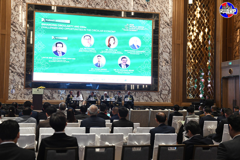 Panelists take part in the Plenary Session Two on “Enhancing Circularity and ESGs – Challenges and Opportunities in the Circular Economy, at the 2025 Global Green and Sustainability Summit in Phnom Penh this afternoon.