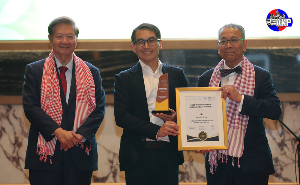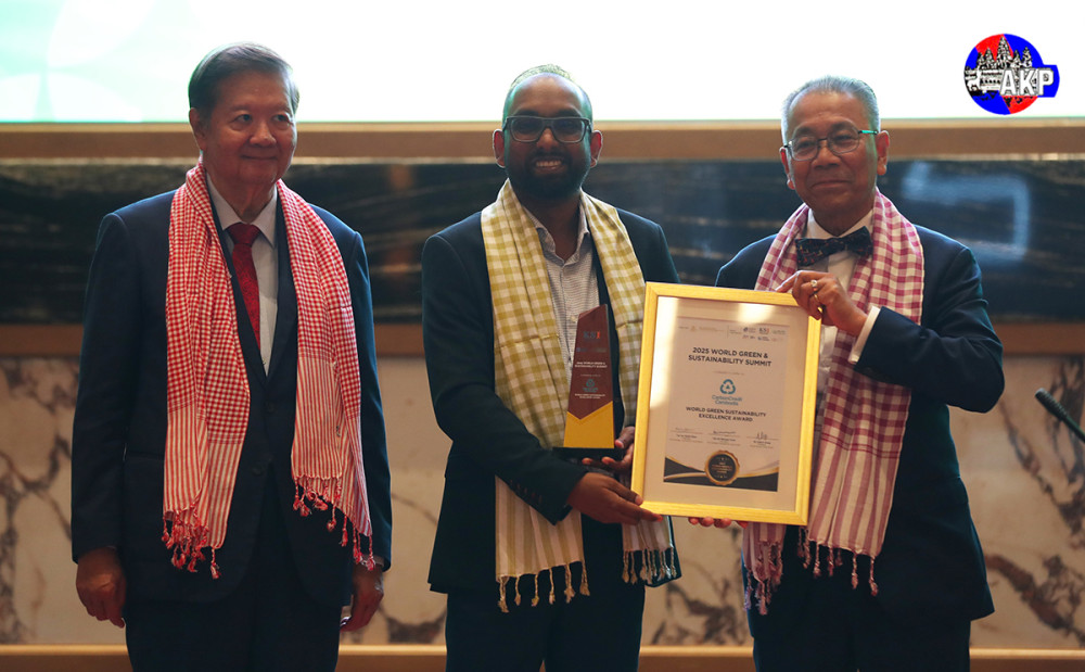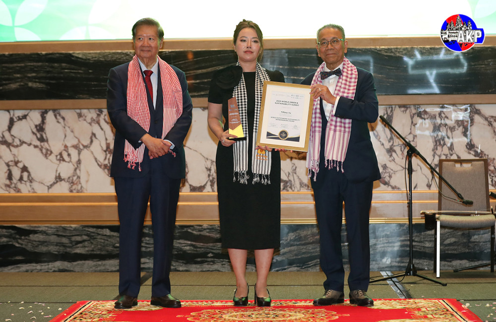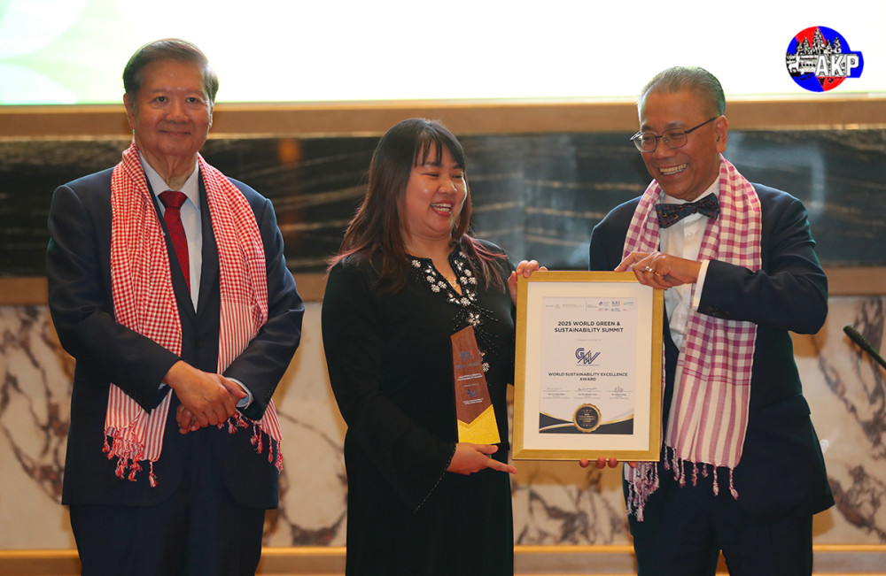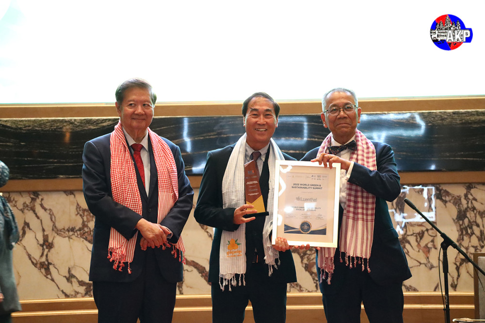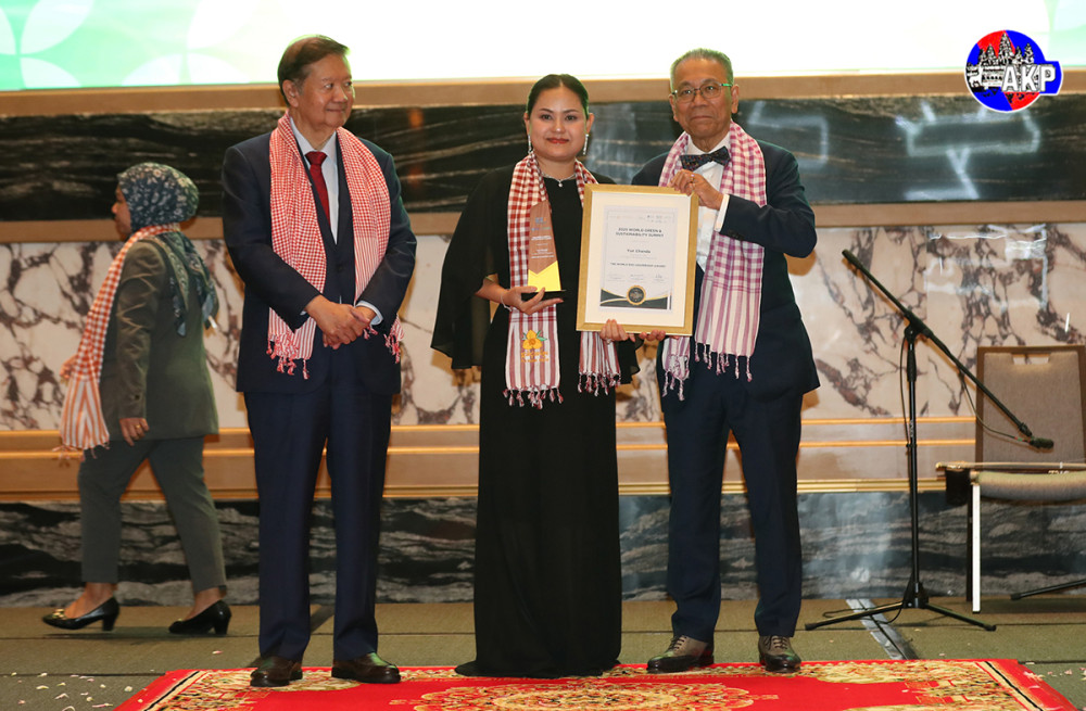 H.E. Dr. Sok Siphana (R, Pic. 1), Senior Minister in charge of Special Missions and Chairman of the Trade Policy Advisory Board (TPAB), and Tan Sri Michael Yeoh (L, Pic. 1), President of KSI Strategic Institute for Asia Pacific and Vice Chairman of UN ESCAP Sustainable Business Network, preside over the presentation of World Green and Sustainability Excellence Awards, at the Closing Reception of the 2025 World Green & Sustainability Summit at the Shangri-La Phnom Penh this evening.