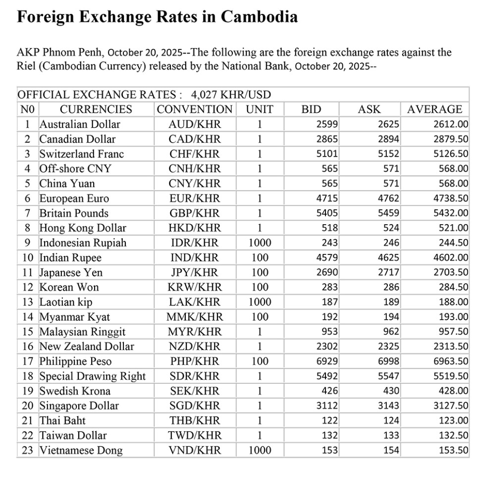 AKP Phnom Penh, October 31, 2025--The following are the foreign exchange rates against the Riel (Cambodian Currency) released by the National Bank, October 31 2025--