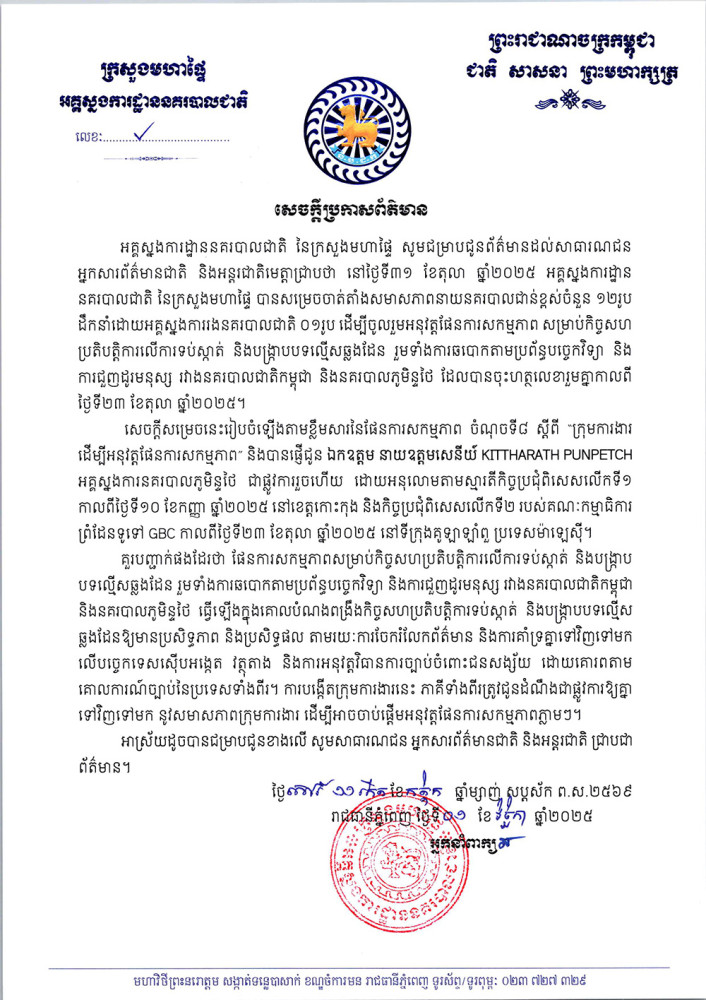 According to the General Commissariat of the National Police, the team, led by a Deputy Commissioner General, will participate in implementing the Action Plan for Cooperation on Preventing and Suppressing Transnational Crimes, including Cybercrime and Human Trafficking, between the Cambodian National Police and the Royal Thai Police, which was jointly signed on Oct. 23, 2025.