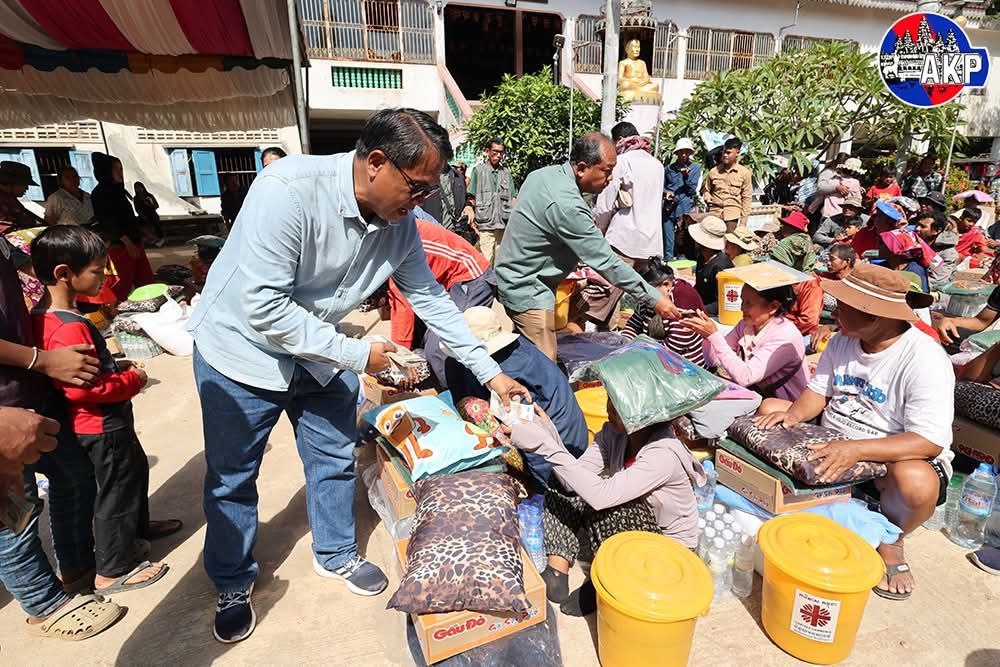 Banteay Meanchey Provincial Governor H.E. Oum Reatrey oversaw the distribution of aid packages at the Chan Sy Samaky Ratanaram Pagoda safety centre on Saturday. Each family received essential supplies, including 25 kilogrammes of rice, instant noodles, a mosquito net, a blanket, a pillow, clean drinking water, and 100,000 Riel (approximately US$25) in cash.