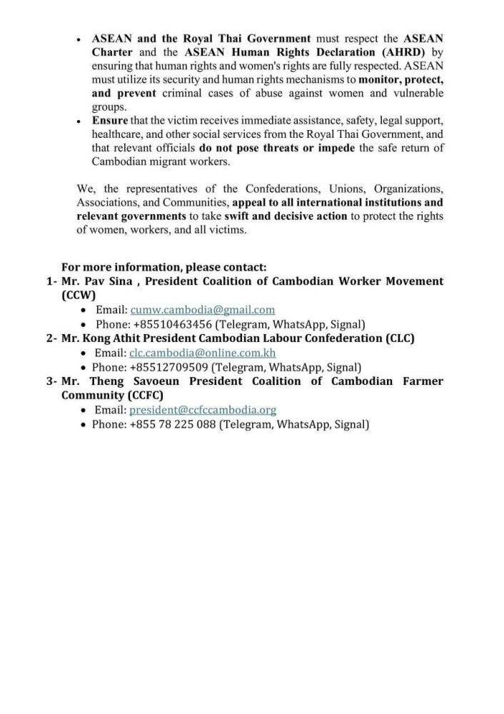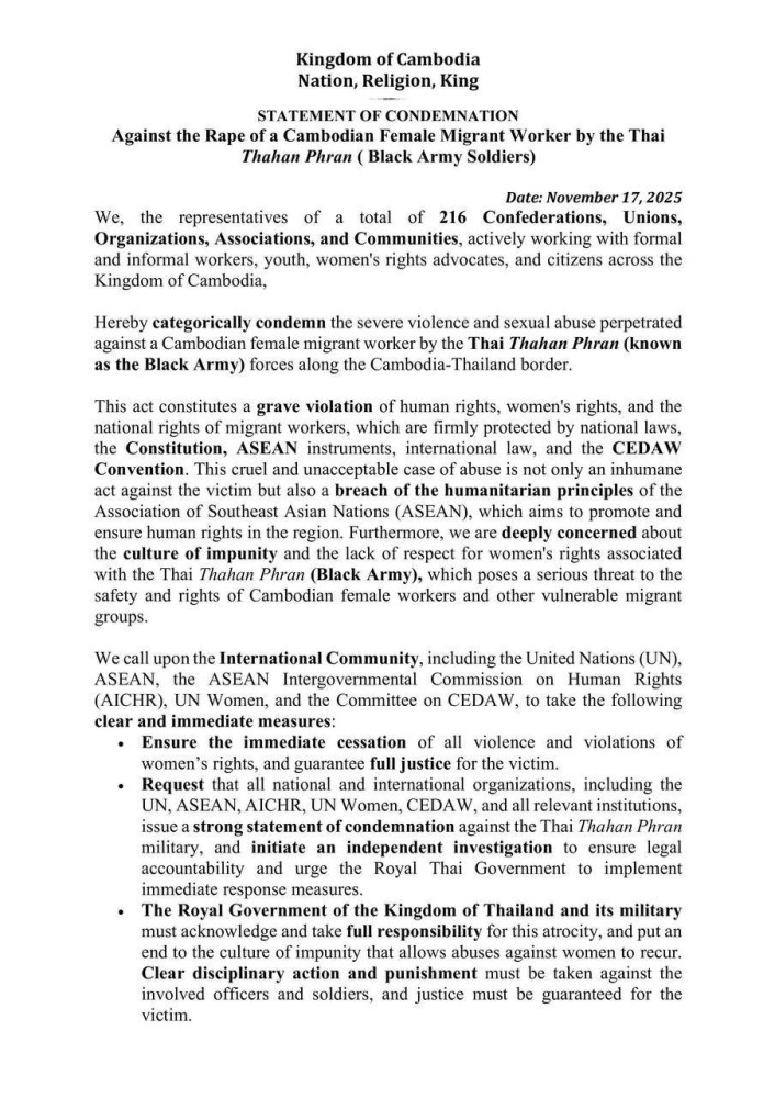 Representatives of a total of 216 Confederations, Unions, Organisations, Associations, and Communities categorically condemned the severe violence and sexual abuse perpetrated against a Cambodian female migrant worker by the Thai Thahan Phran (known as the Black Army) forces along the Cambodia-Thailand border.